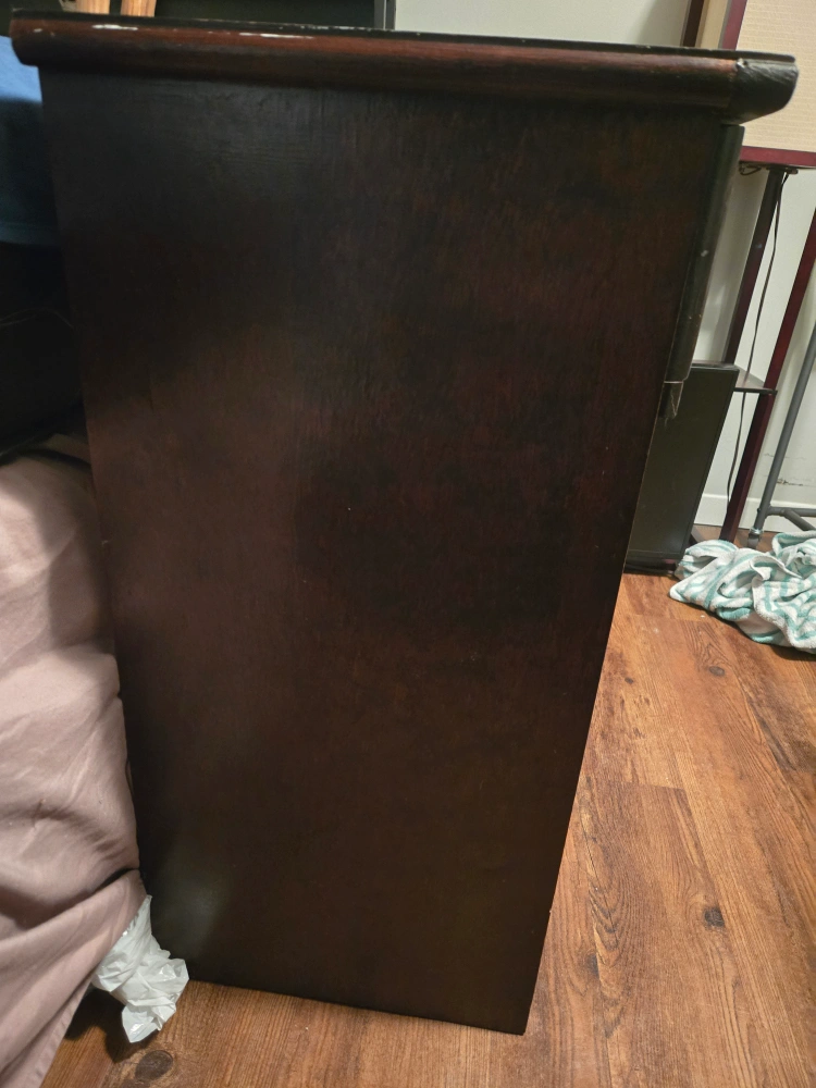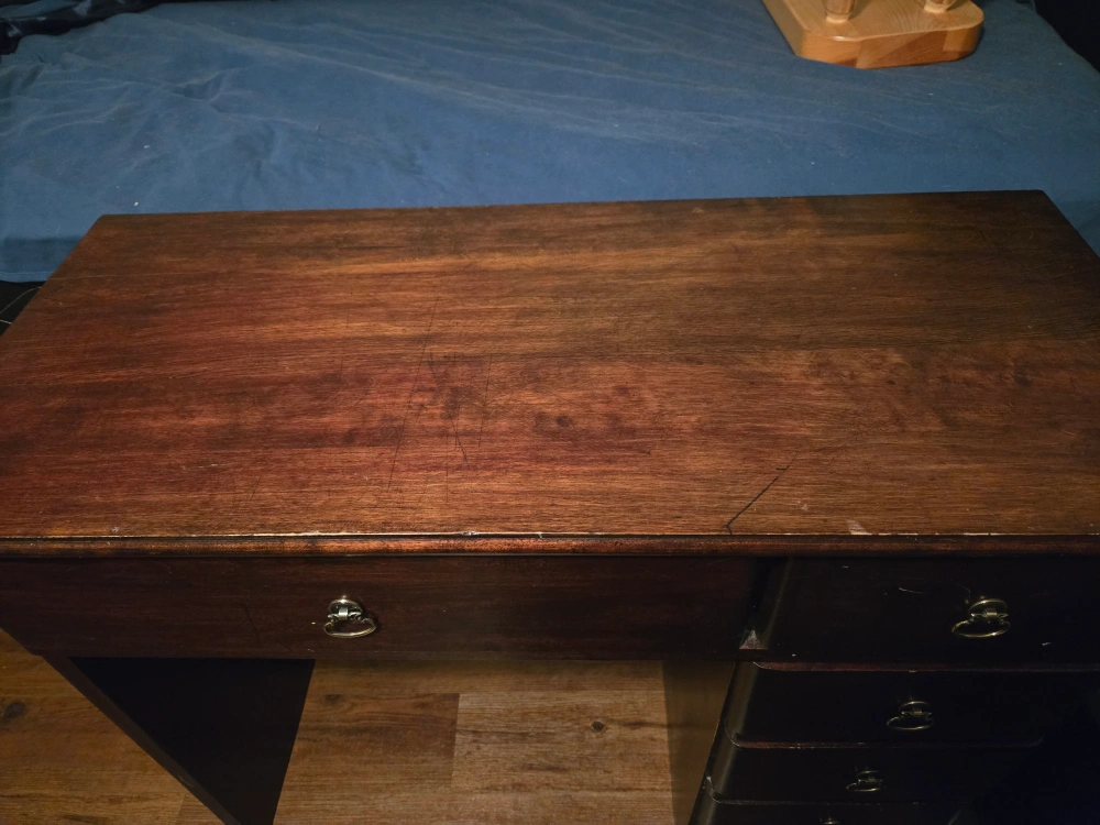 This is a dark wood desk with several drawers for storage. It's a classic design suitable for a home office or bedroom. The wood has a nice grain pattern.