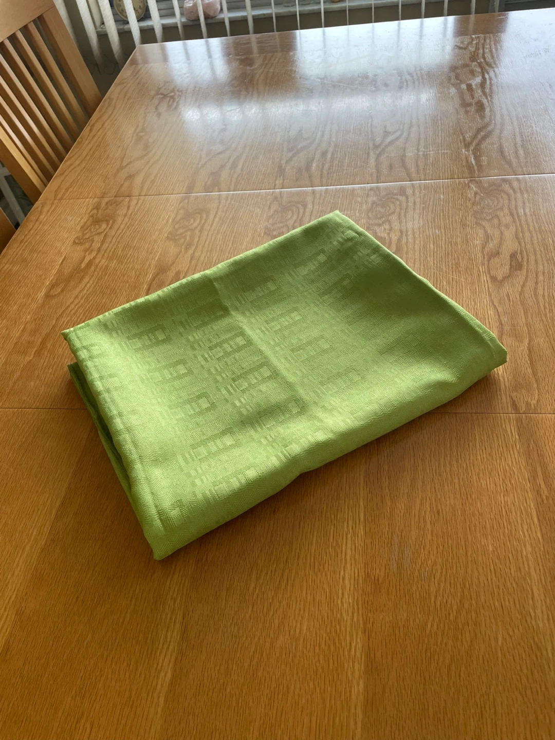 This is a light green tablecloth with a subtle textured pattern. It's generously sized to fit most standard dining tables. Add a touch of colour to your next meal!