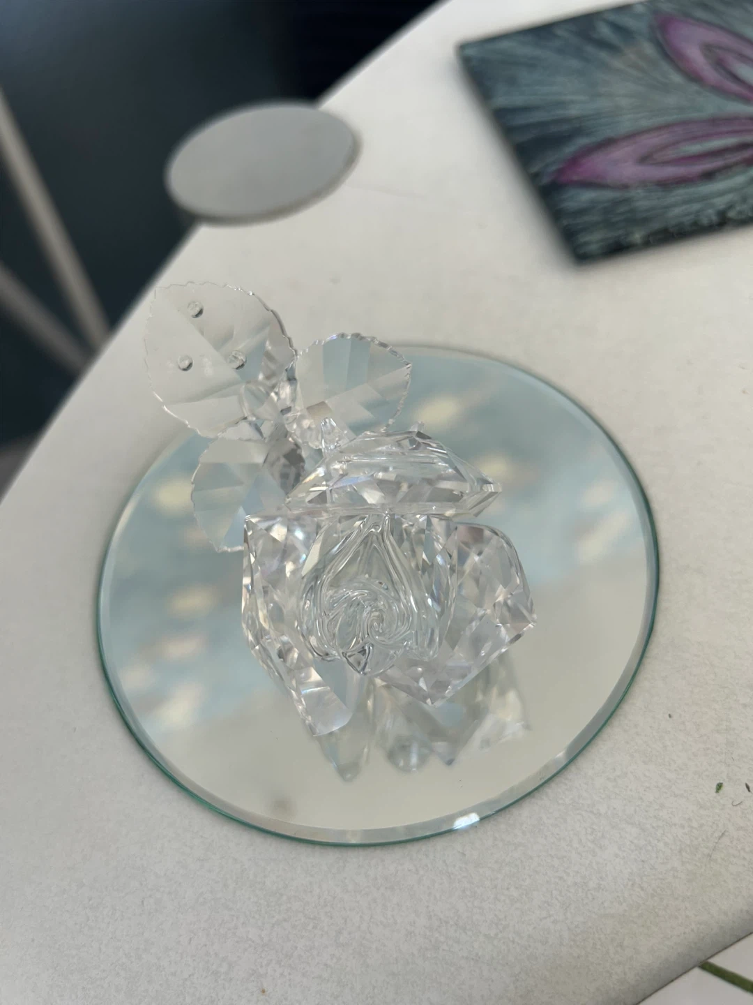 Beautiful crystal rose figurine. Crafted from clear glass with intricate detailing on the petals and leaves. It's a lovely decorative piece for any shelf or table.