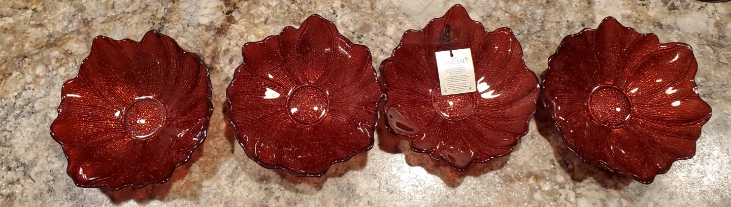 This Brand NEW set includes four decorative glass bowls. They're designed with a red, flower-like shape, adding a touch of elegance to any table.