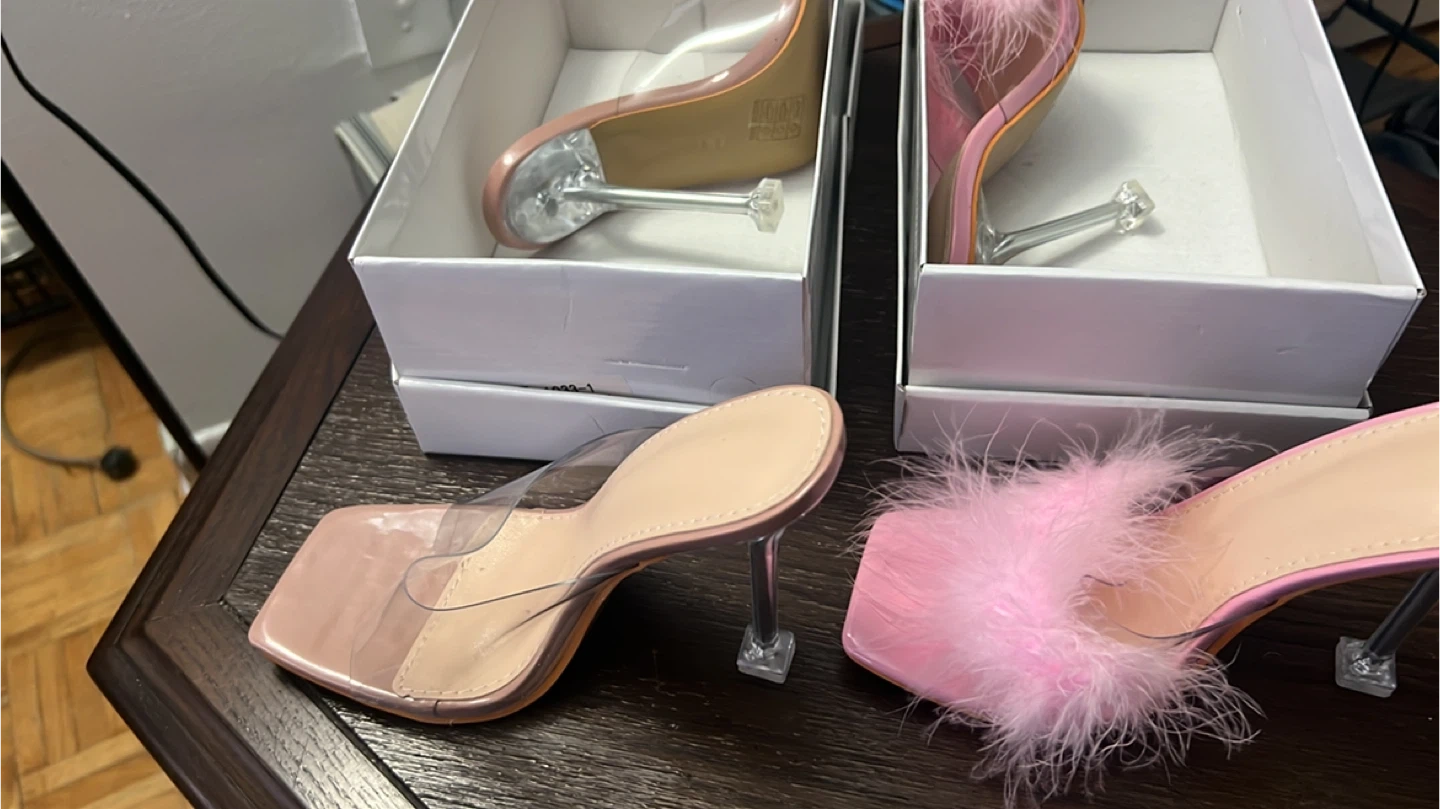Two pairs of stylish square-toe mules included. One pair features a fluffy pink feather trim, and the other has a clear strap design. Both have clear block heels and come in their original boxes. ($25 both.)