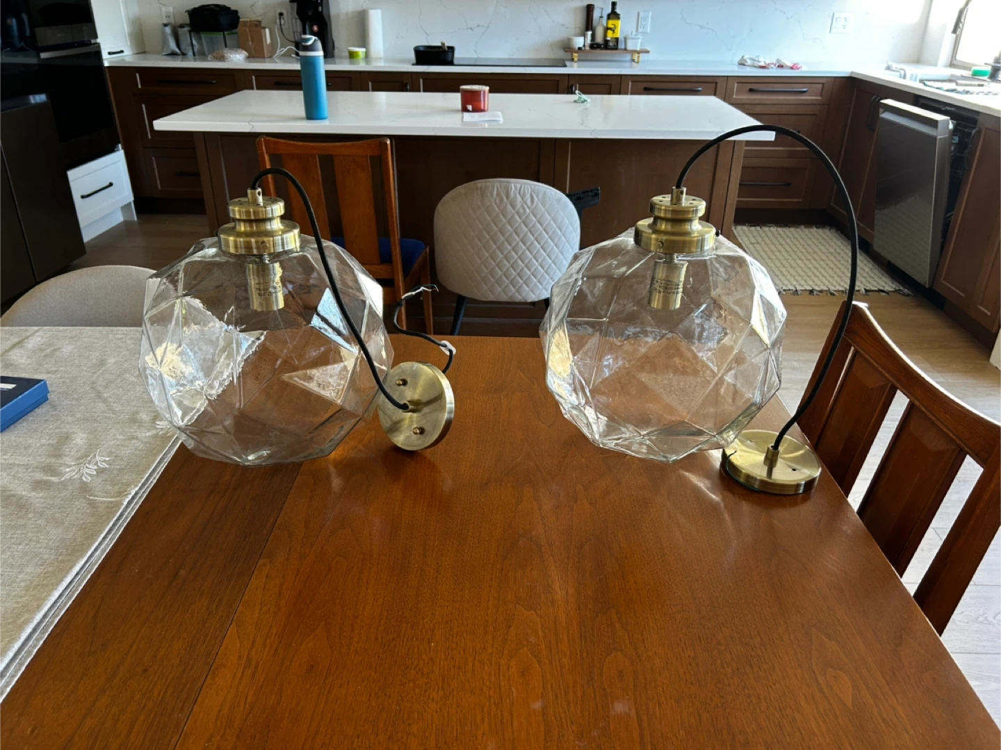 Selling a set of two geometric glass pendant lights. They have a unique design and would look great in any room. The fixtures are brass coloured and the shades are clear glass.