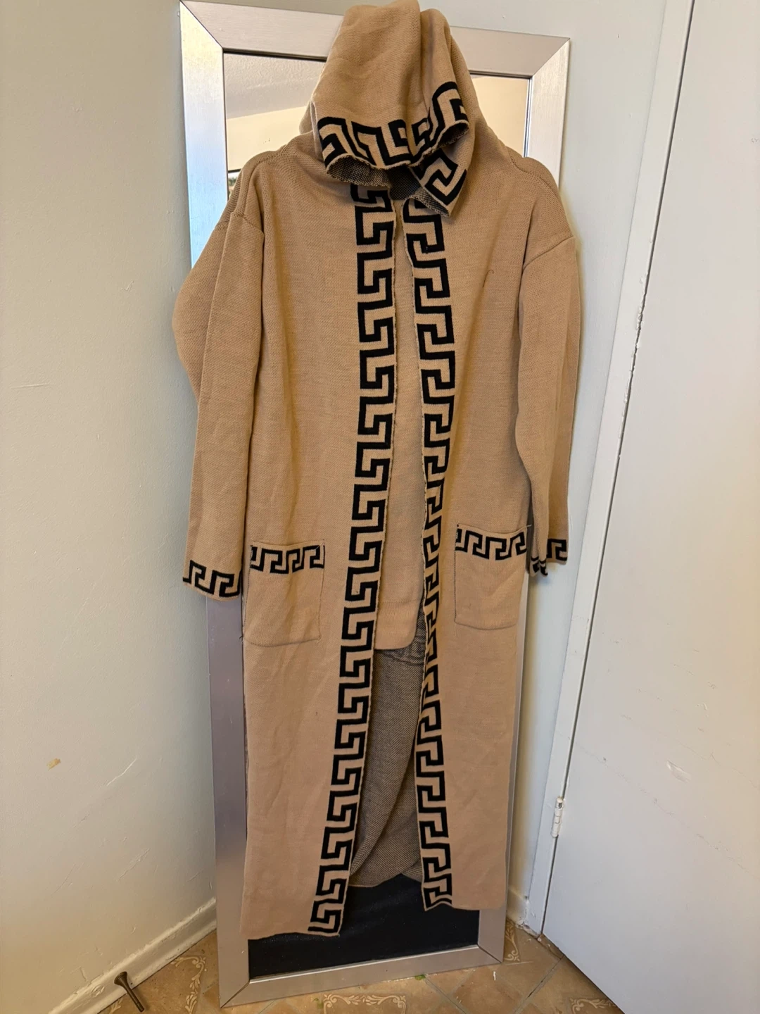 This long knit cardigan features a camel colour with a black Greek key trim and a large Medusa head print on the back. It has an attached hood and front pockets. It's a cozy layering piece.