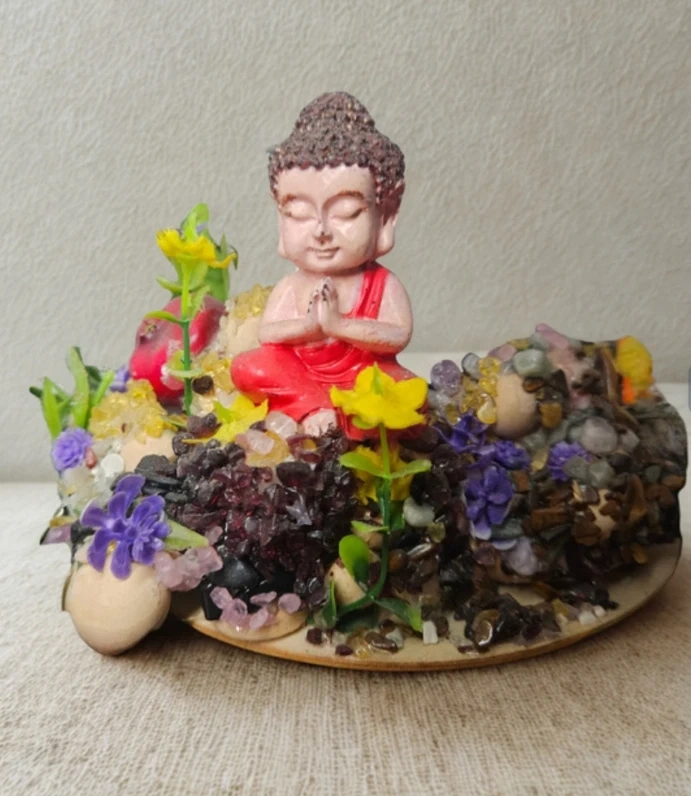 Magnifique petite figurine de Bouddha en position de prière, entourée de fausses pierres et de fleurs colorées. Parfait pour ajouter une touche zen à votre décor intérieur. Ses dimensions sont idéales pour une étagère ou un bureau.