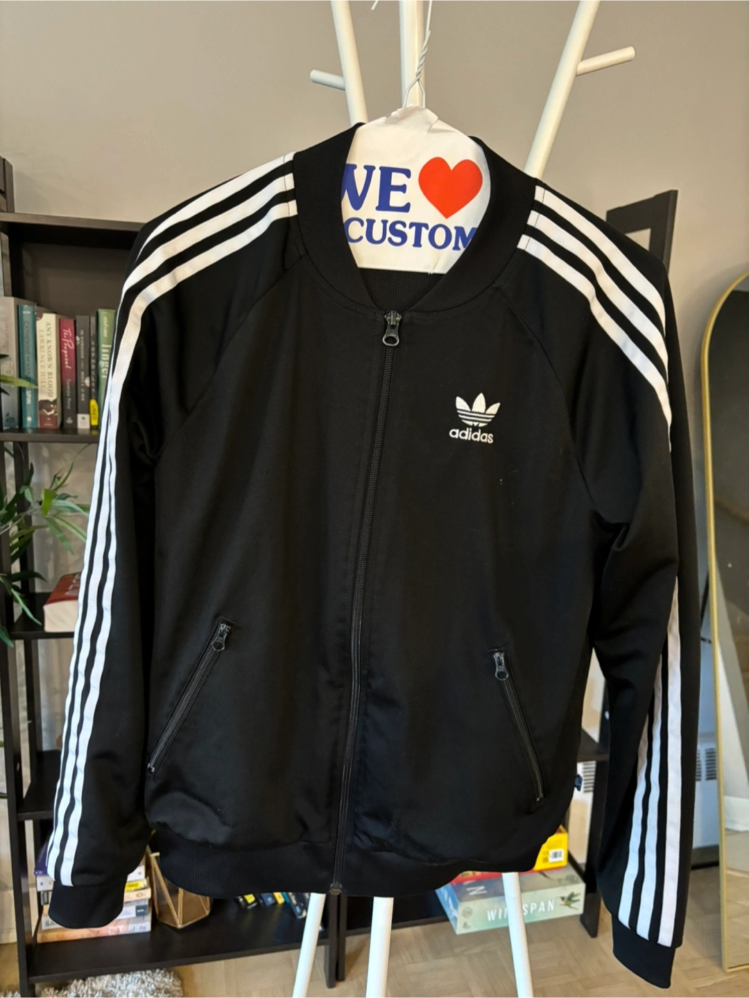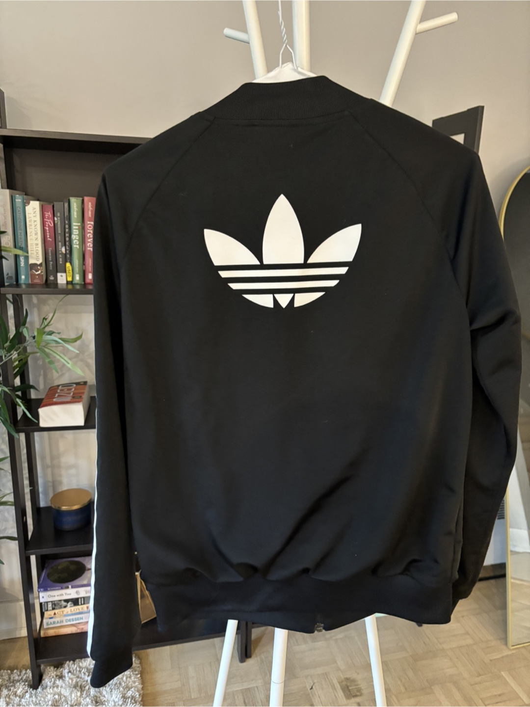 Black Adidas bomber jacket. Features white stripes on the sleeves and a large Adidas logo on the back. Zip closure. Pockets.