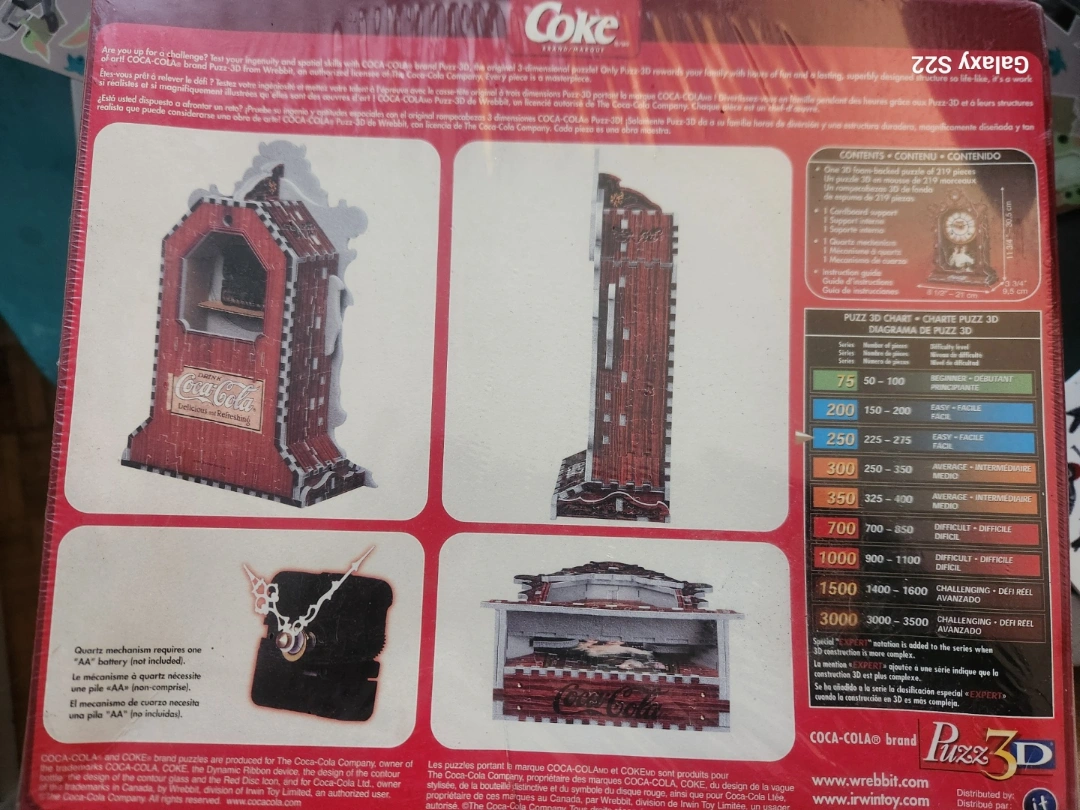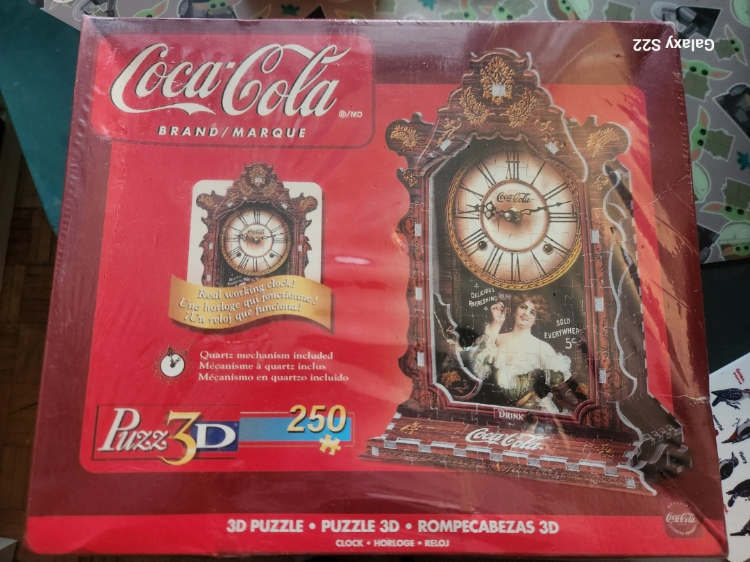 Assemble a 250-piece 3D puzzle of a Coca-Cola clock. Quartz mechanism included. Collectible item for Coca-Cola enthusiasts. Box is a wee bit dusty but still in plastic.