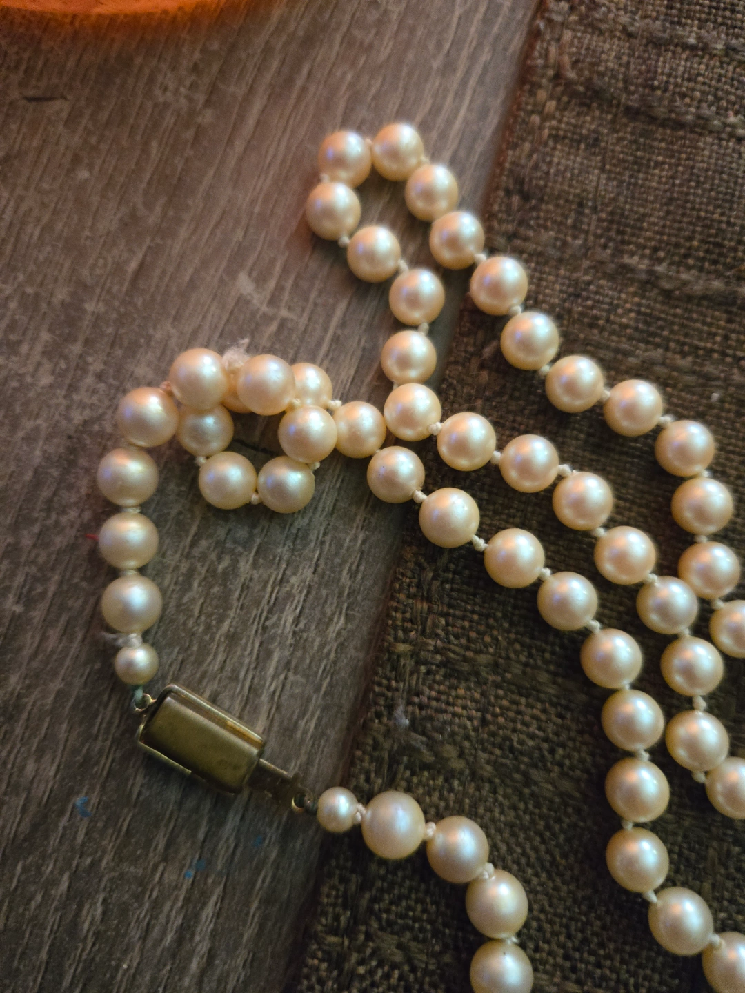 Classic pearl necklace. Cream-coloured pearls. Gold-toned clasp. Elegant and timeless style. Perfect for any occasion.