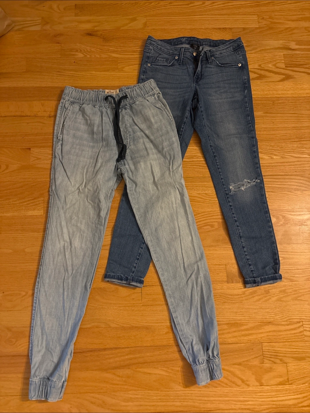 Bundle of two pairs of women's jeans. One light wash jogger style with elastic cuffs. The other dark wash distressed skinny jeans