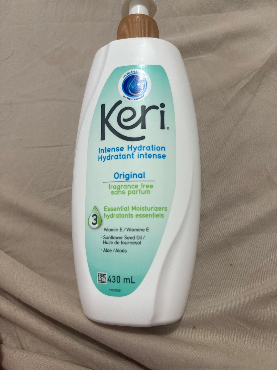 430ml bottle of Keri Intense Hydration lotion. Original scent, fragrance free. Contains Vitamin E, sunflower seed oil, and aloe.
