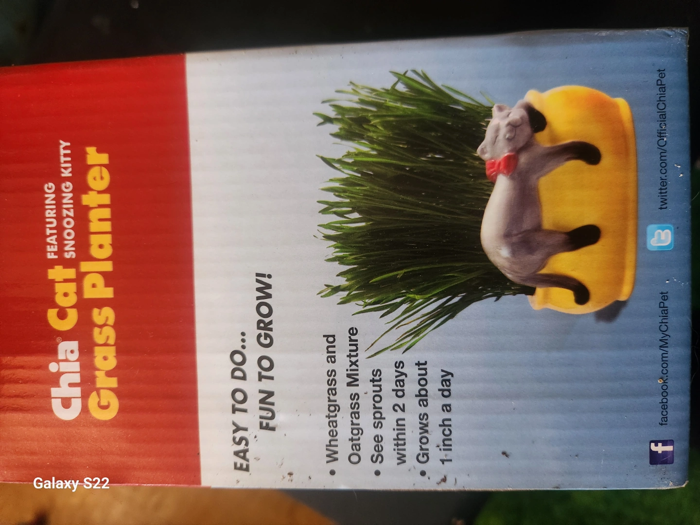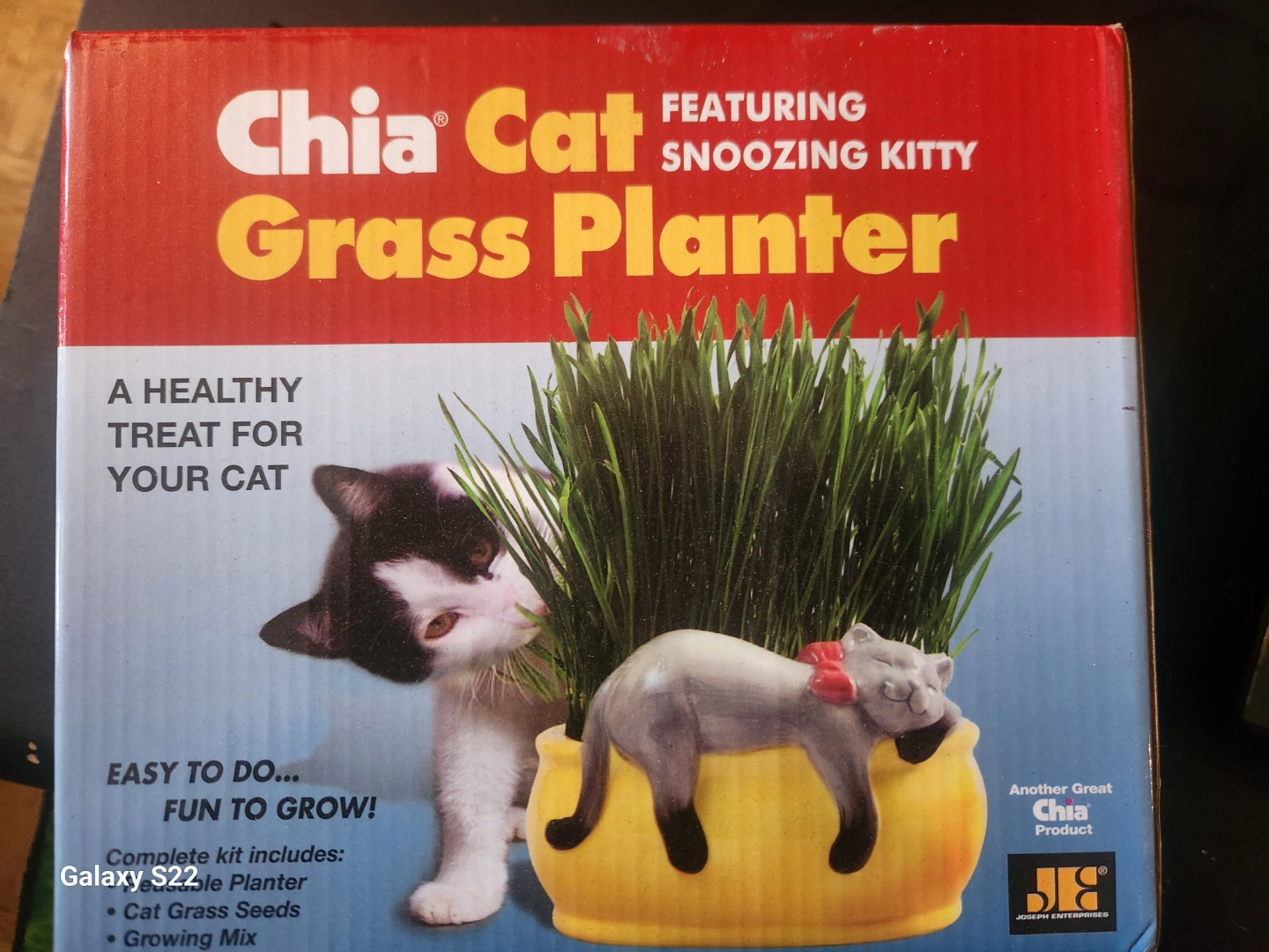Fun cat grass planter kit. Includes planter, cat grass seeds, and growing mix. Features a cute sleeping kitty planter. Easy to use and fun to grow!