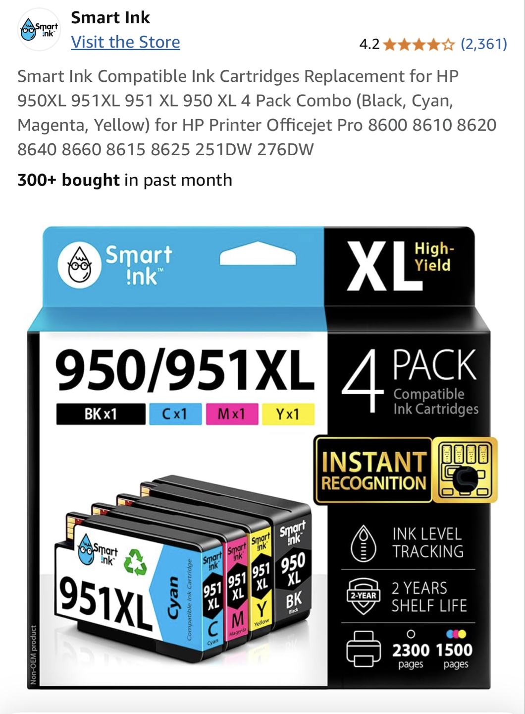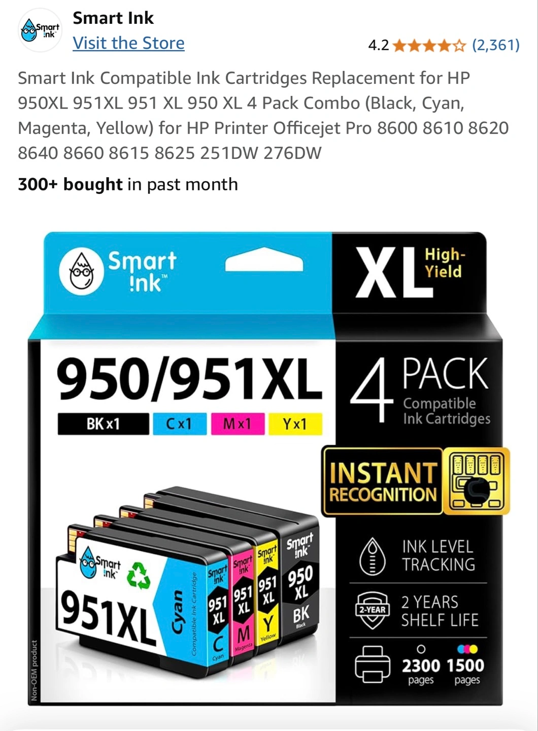 Four-pack of Smart Ink compatible ink cartridges. Replaces HP 950XL and 951XL. Black, Cyan, Magenta, and Yellow included. Compatible with HP Officejet Pro 8600, 8610, 8620, 8640, 8660, 8615, 8625, 251DW, and 276DW printers. High-yield.