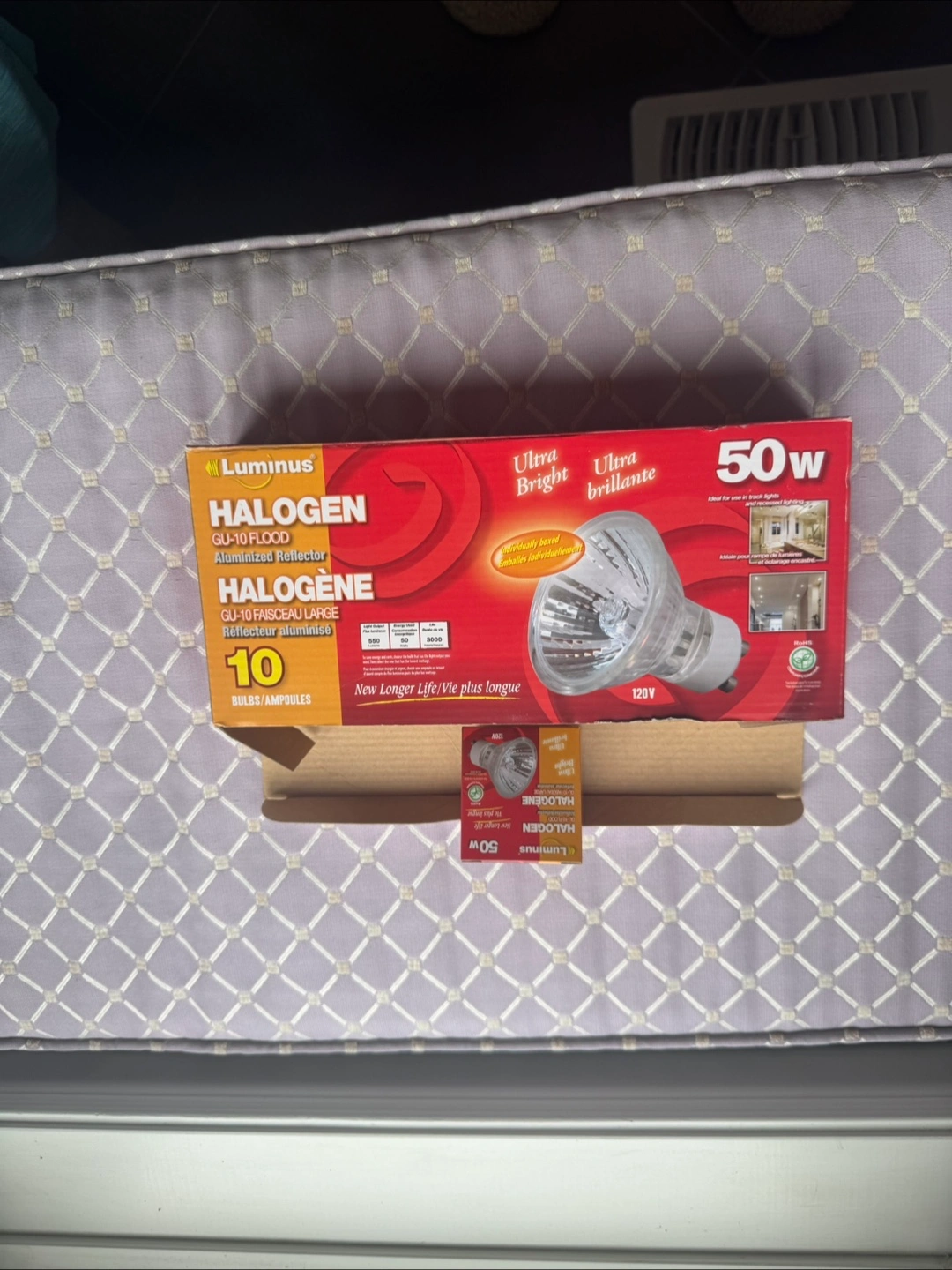 15New, unopened box of ten 50W Luminus halogen bulbs. GU-10 flood, aluminized reflector. Ultra bright. I have 19 of them