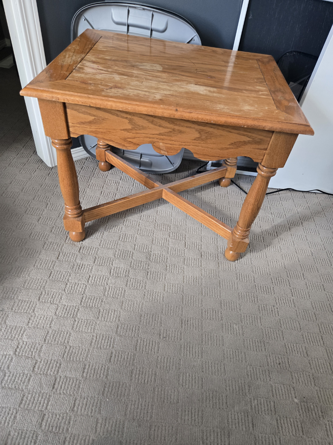 Small square coffee table. Solid oak wood construction. Some wear and tear on the top surface. Four turned legs with an X-shaped stretcher. Simple design, great for a small space.