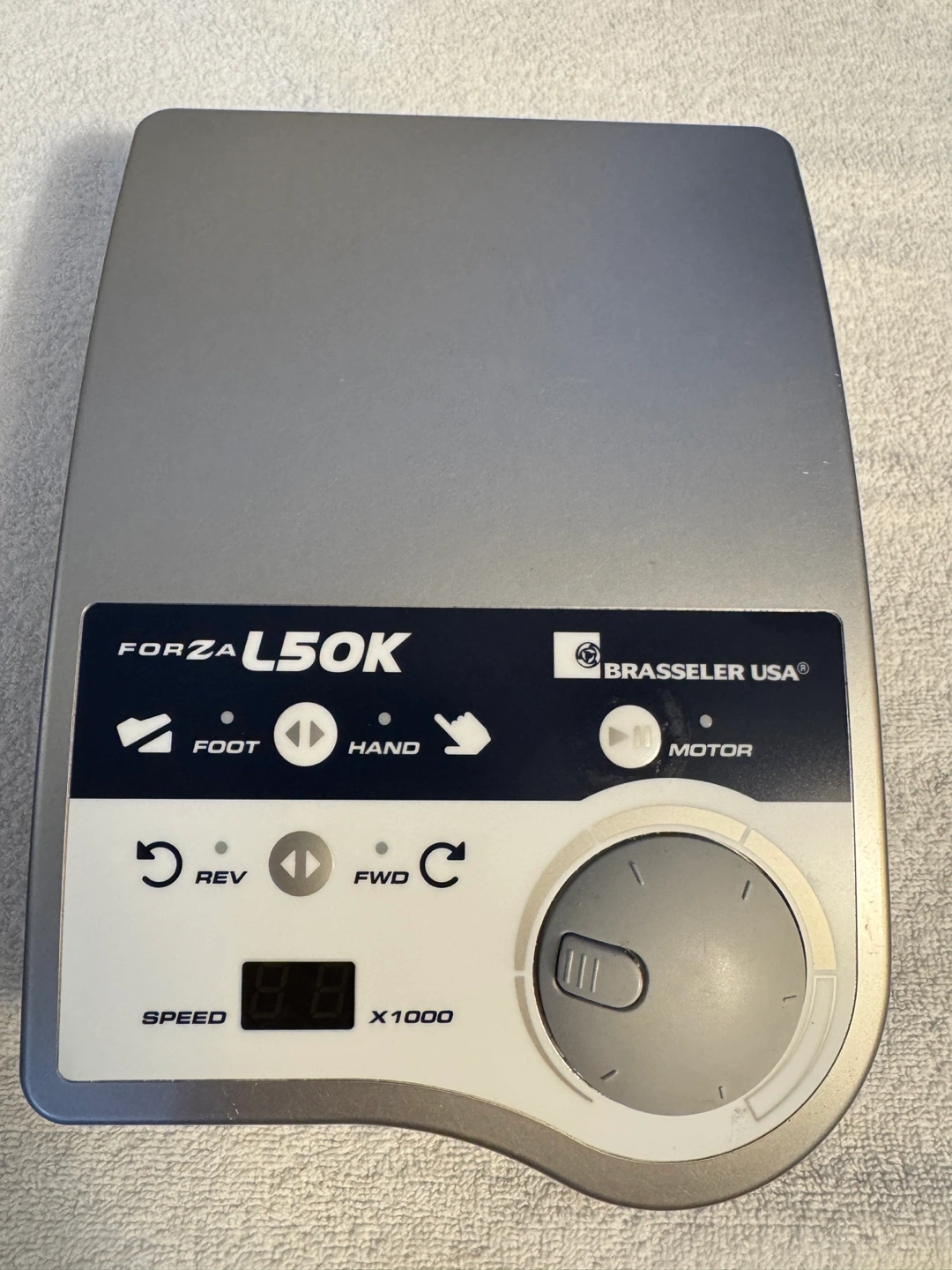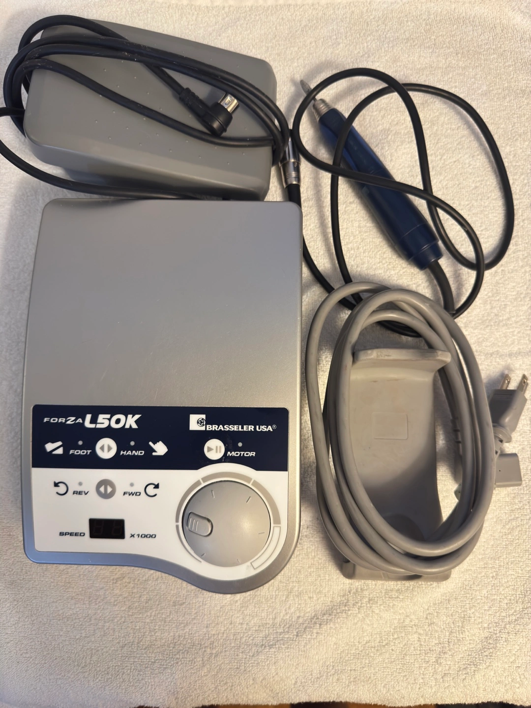 Brasseler USA Forza L50K micromotor handpiece system. Includes control unit, handpiece, foot control, and power cord. Used condition.
