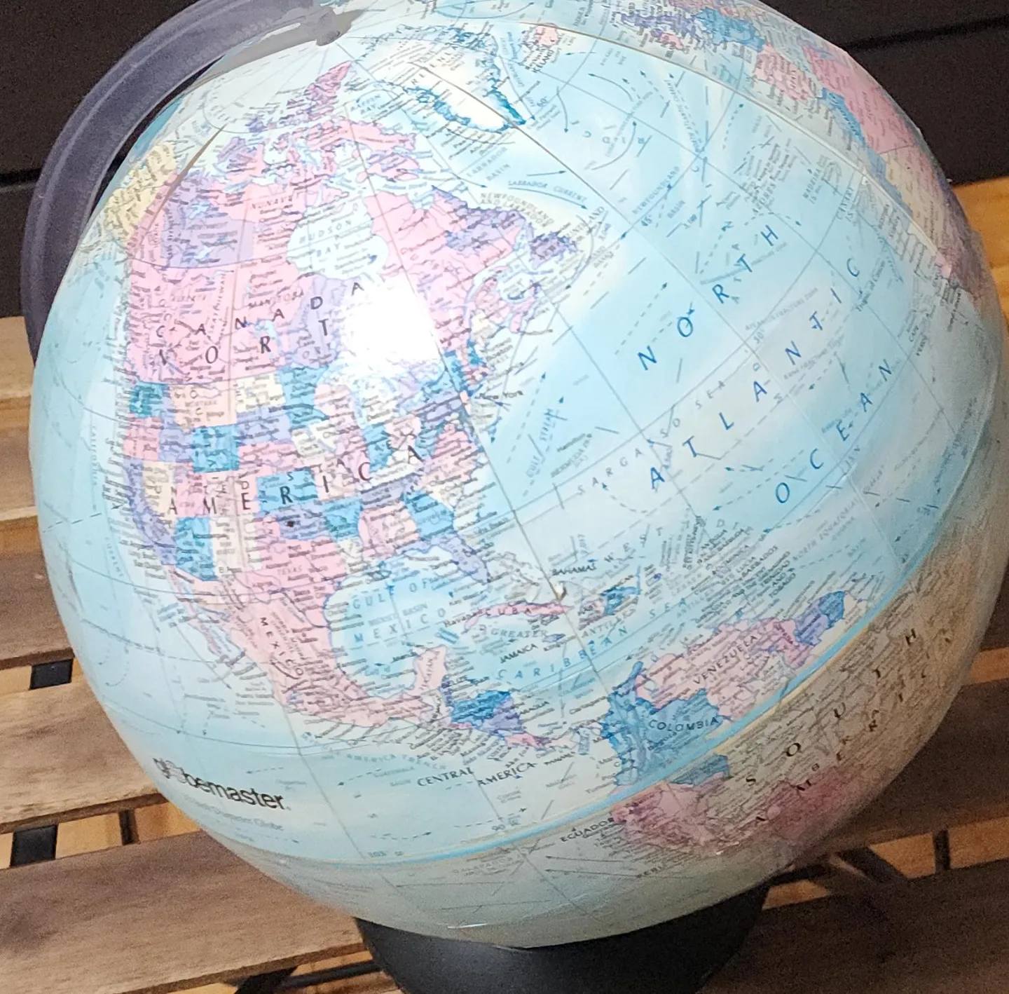 Vintage desk globe. Shows North and South America, the Atlantic Ocean and surrounding areas. Features detailed maps and ocean currents.