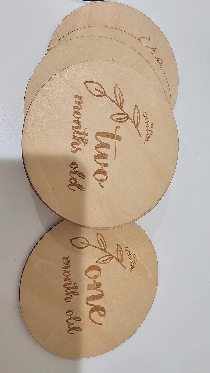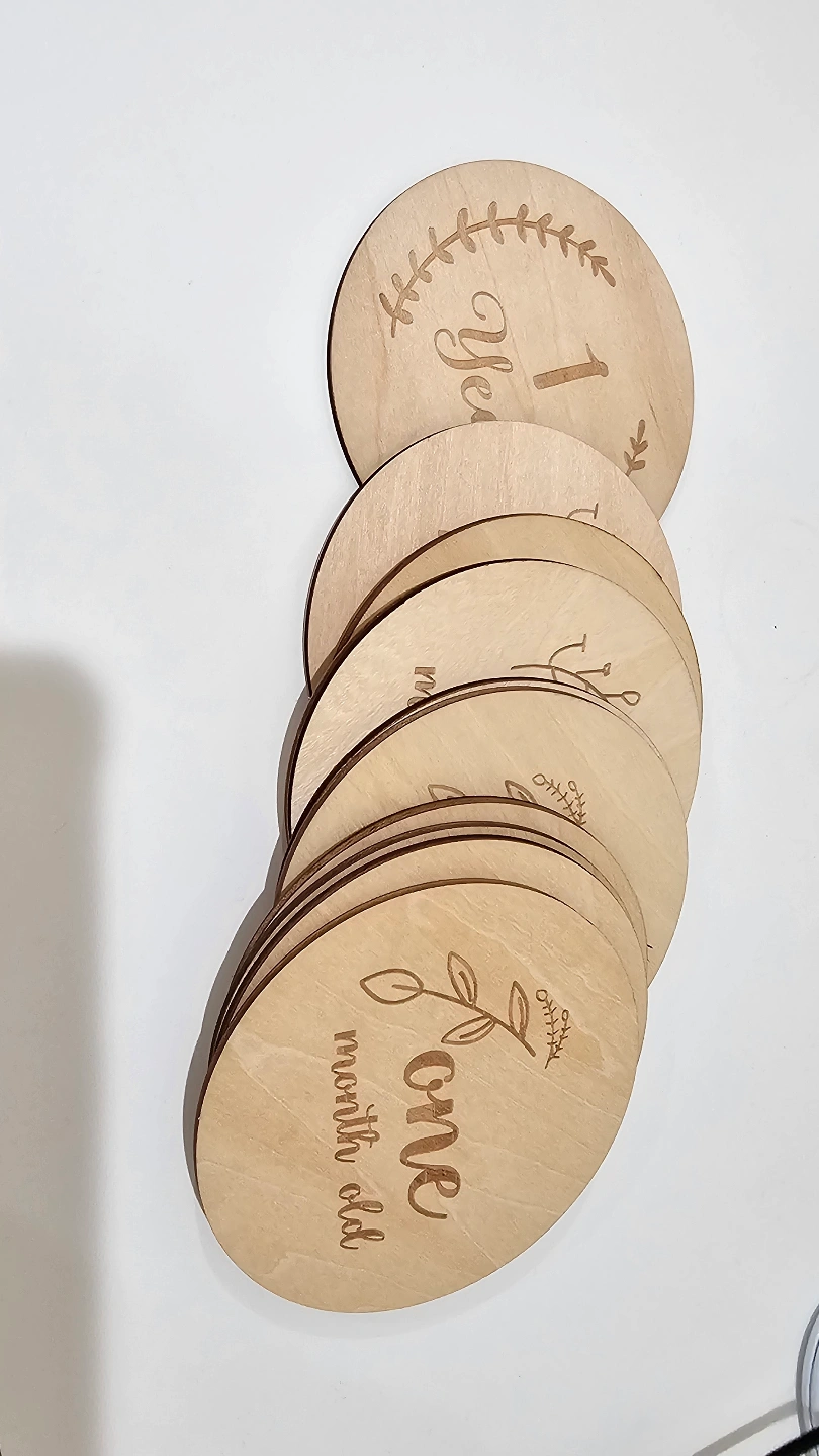 Adorable set of engraved wooden discs. Perfect for monthly baby photos. Includes 12 months plus one year. Comes in a cute cotton drawstring bag. Great for baby shower gift.