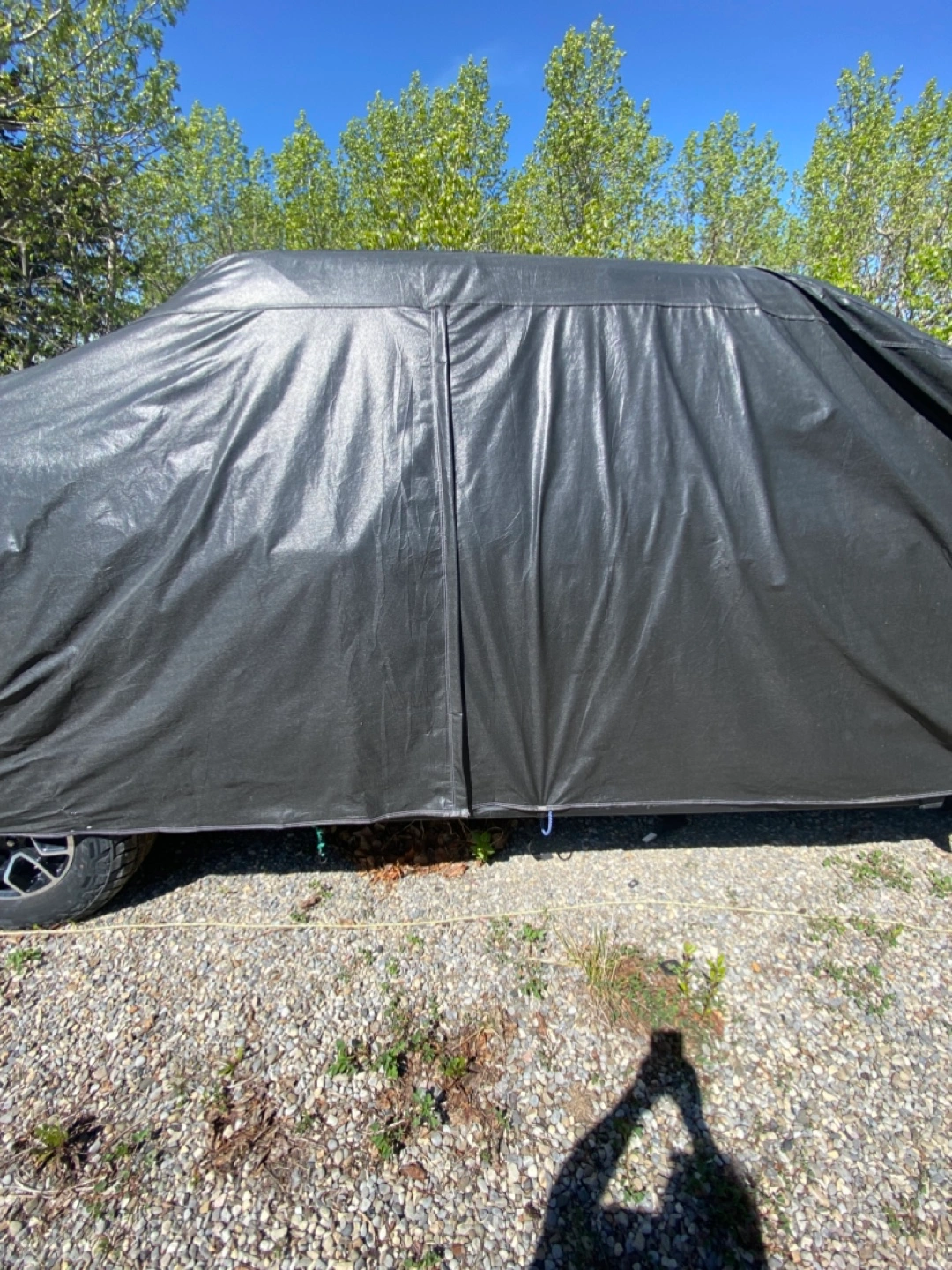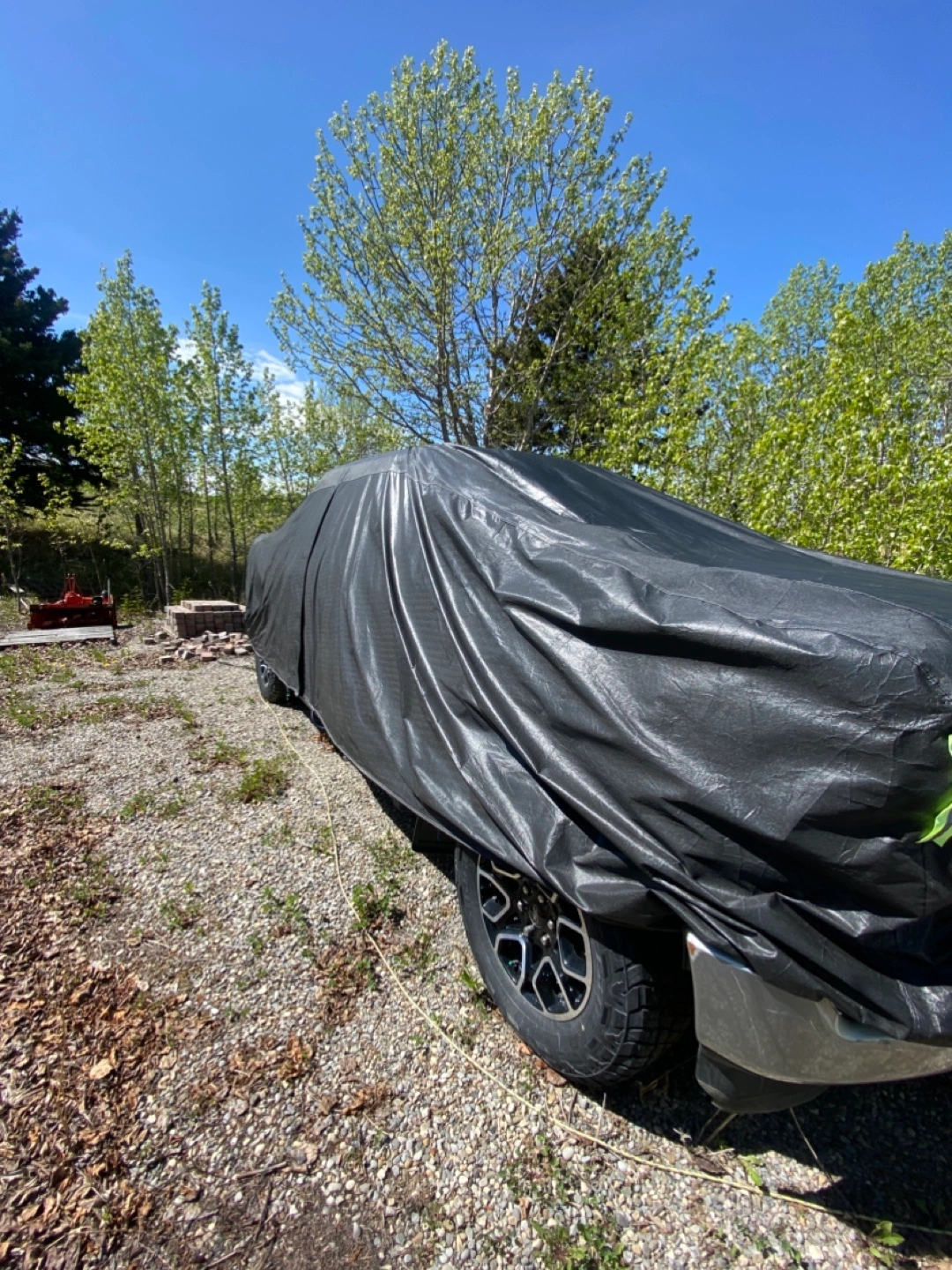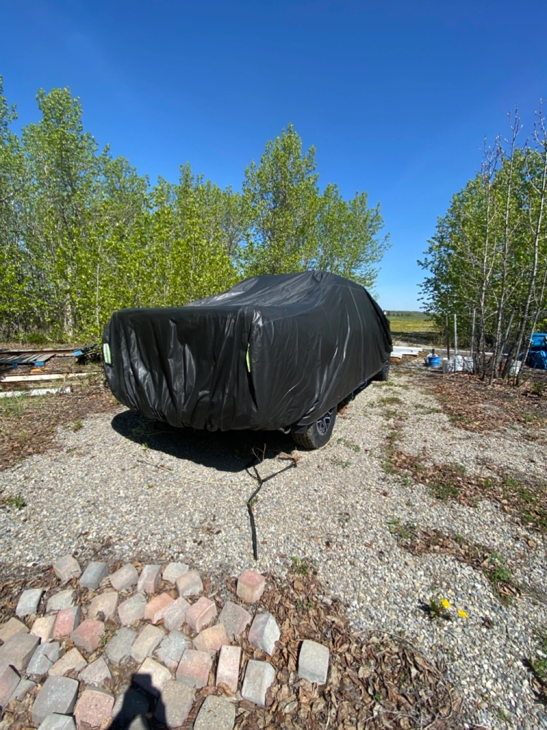 Heavy-duty black truck cover. Keeps your vehicle protected from the elements. Good condition, minor wear. Suitable for outdoor use. Durable material.