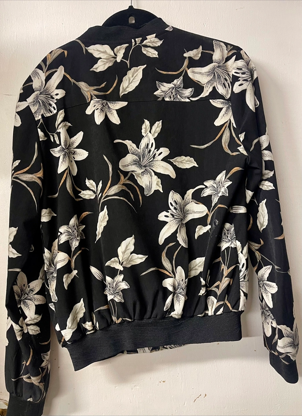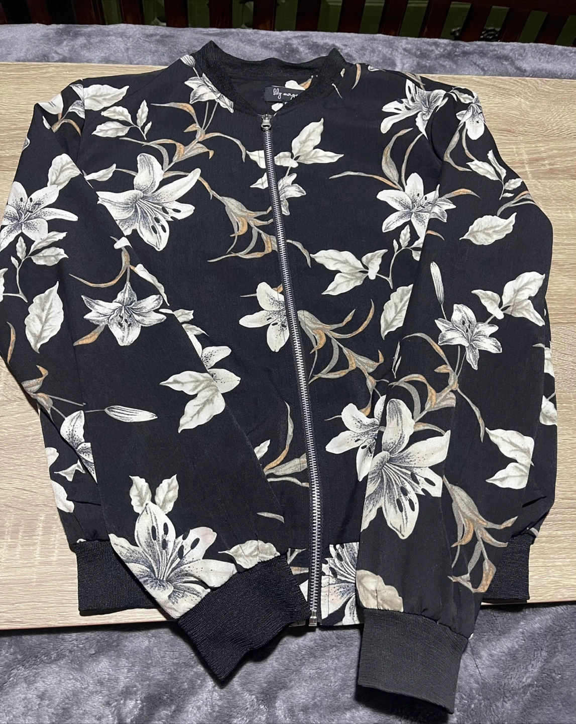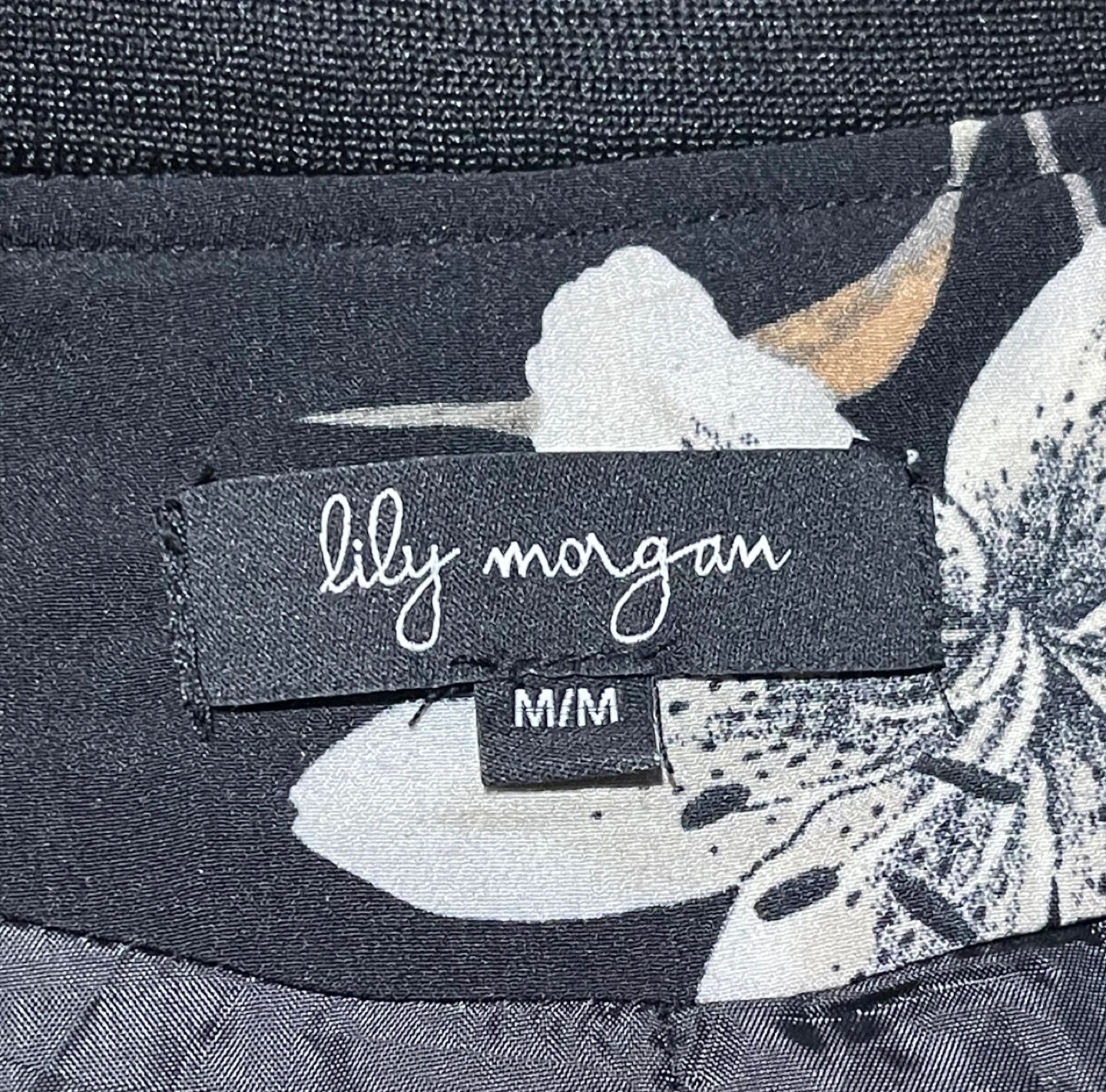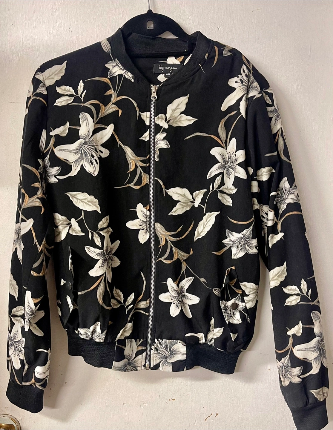 Brand: Lily Morgan Item: Zip up, Black bomber jacket. Features a white and grey floral print. Zip closure. Long sleeves. Ribbed cuffs and hem. Size: Medium Condition: New If you are interested in this item feel free to message me. Thanks.