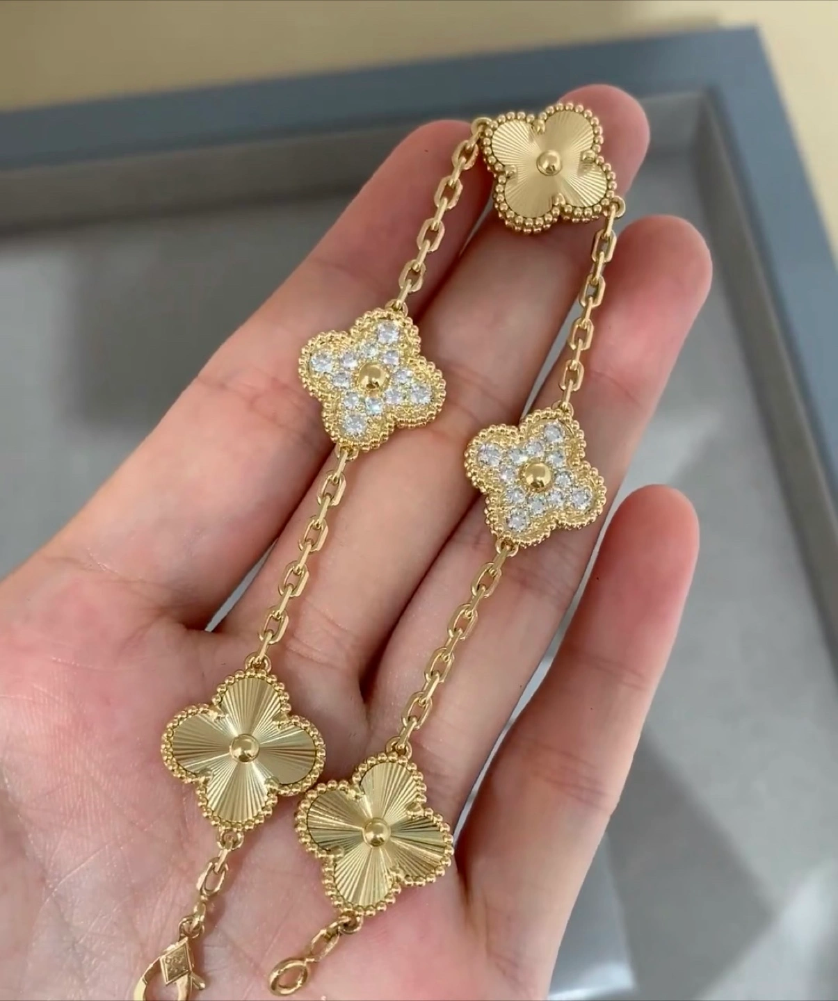 Gorgeous gold filled bracelet. Features iconic clover design. Diamonds accent some clover designs. Elegant and luxurious. Box available for $30 with bag too