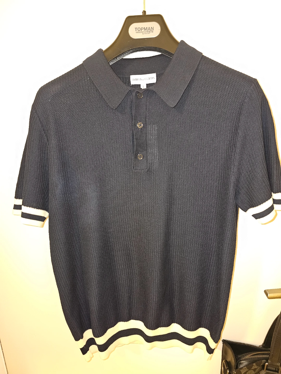 Hawes&Curtis navy cotton polo is your new styling saviour. The ribbed detailing at the cuffs and hemline provide a flattering shape and stretch with every wear. The cotton has a luxurious sheen with a crisp but smooth handle.