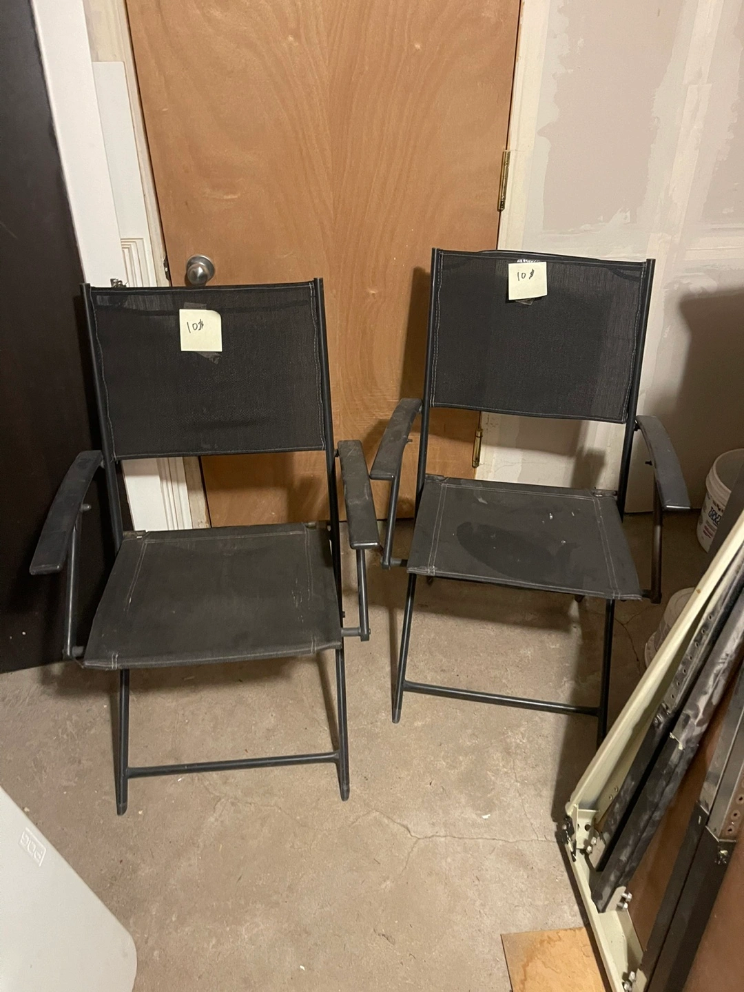 Two black folding chairs, metal frame, fabric seat. Good for indoor or outdoor use. Some wear and tear.10$ each no delivery cash please