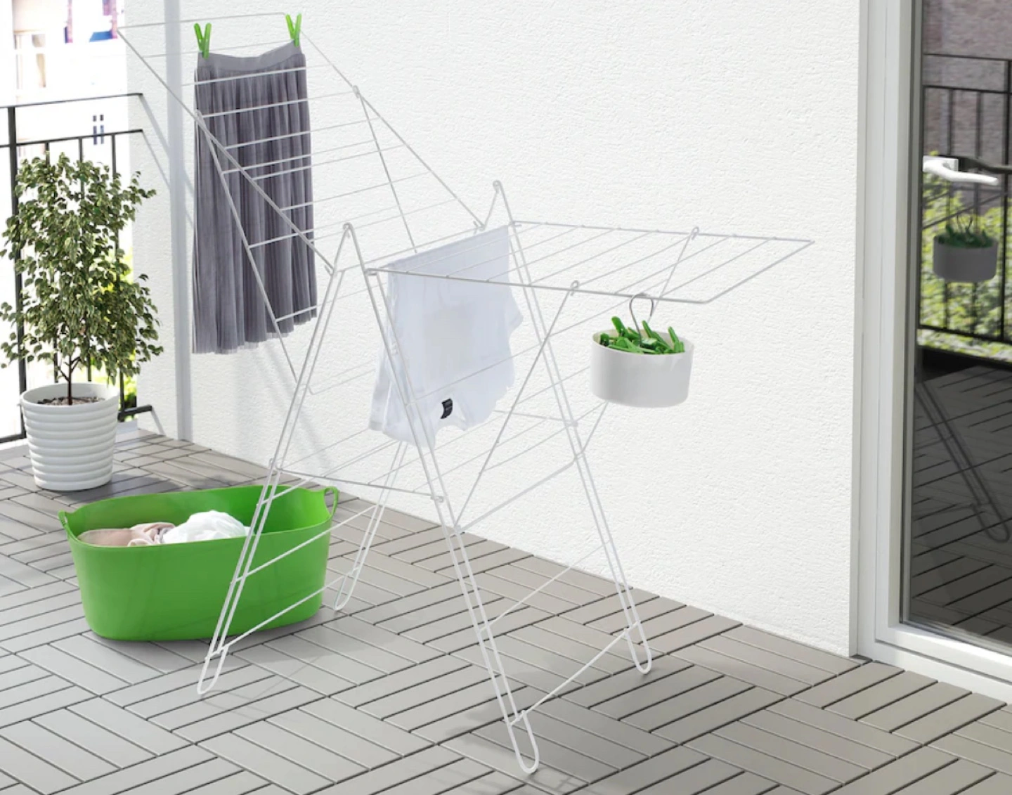 Indoor/outdoor drying rack. White colour. Foldable design. Great for small spaces.