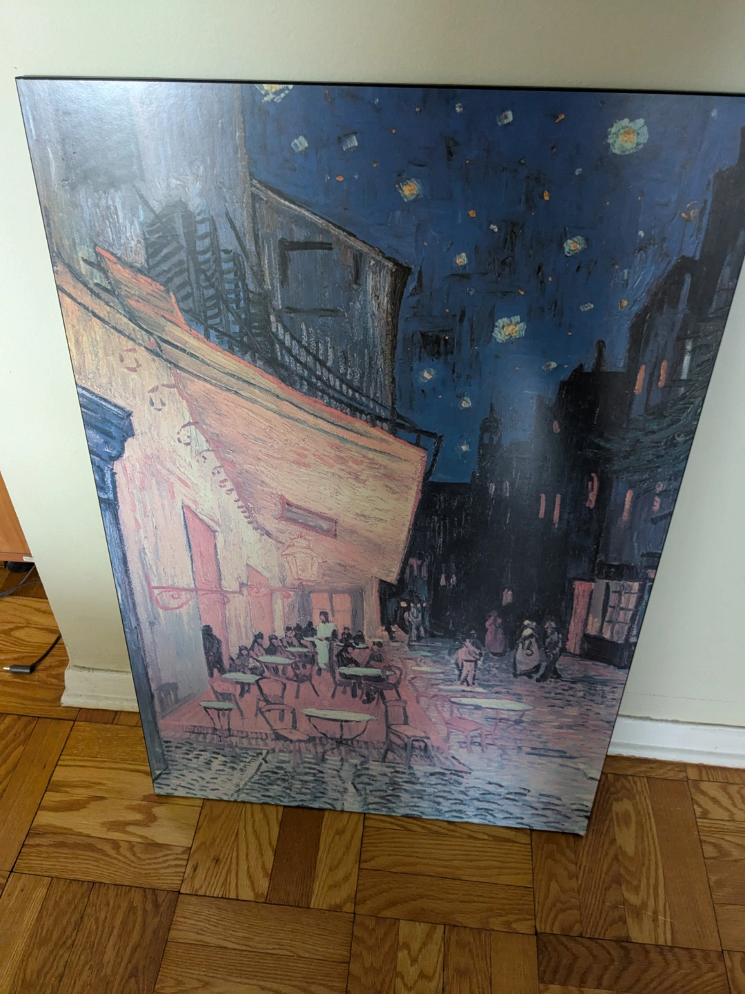 Wall Art replica of Van Gogh's Cafe Terrace at Night. Beautiful colours. Slight damage to one corner. Dimensions are 25 by 35 inches. Pickup is near Eglinton and Spadina. Cash only please.