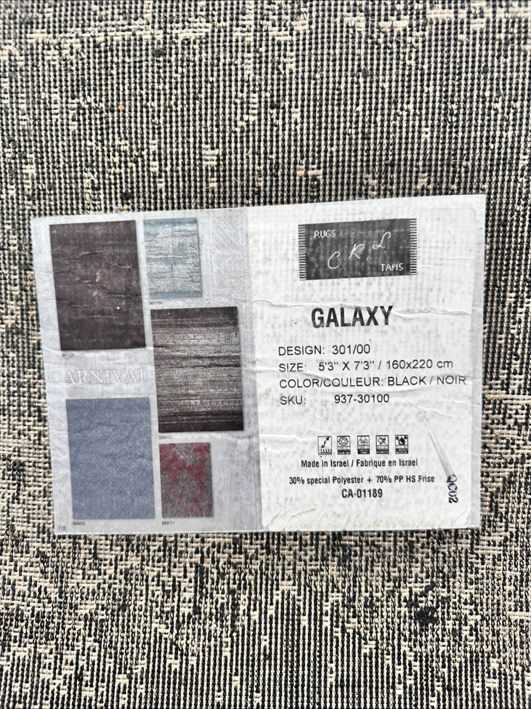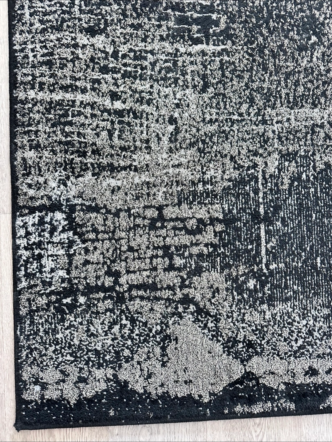 Modern area rug. Black and silver colour. Abstract design. Made in Israel. 5'3" x 7'3". 30% special polyester + 70% PP HS Frise. 100% Smoke and Pet free home.