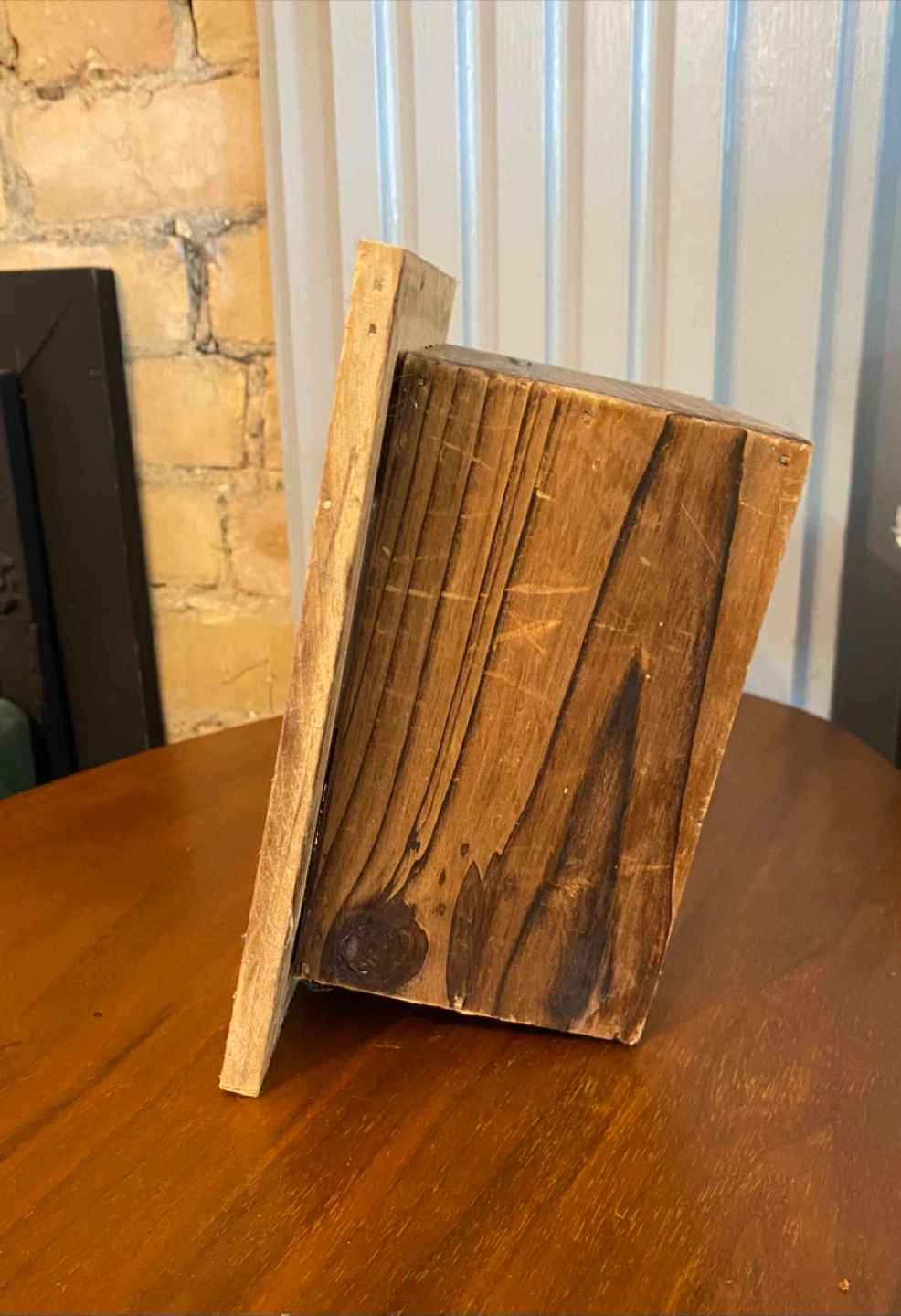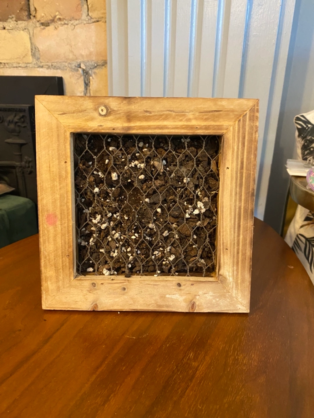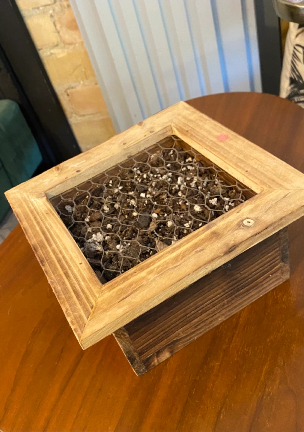 Small square planter box. Made of wood. Features chicken wire insert. Perfect for succulents or small plants. Ready for your greenery!