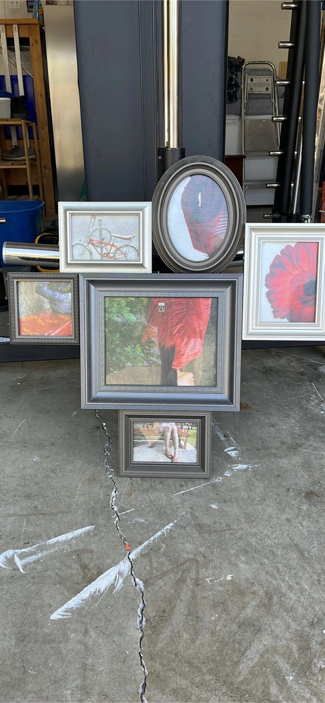 Five picture frames, various sizes and styles.