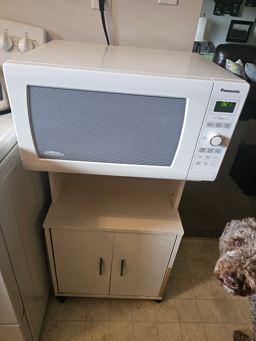 White Panasonic microwave with inverter technology. Features various cooking options. Includes a white cabinet stand with two doors. Pre-owned.