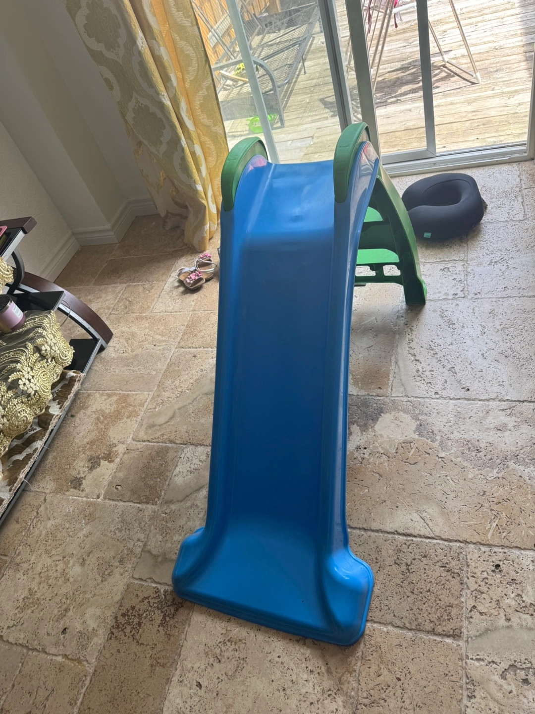 121Small plastic slide. Blue and green. Good for toddlers. Indoor or outdoor use.