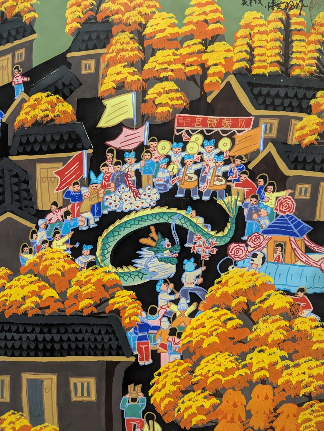 Hand-painted artwork depicting a lively village scene. Features a dragon, people celebrating, and autumn foliage. Bright colours and unique style.