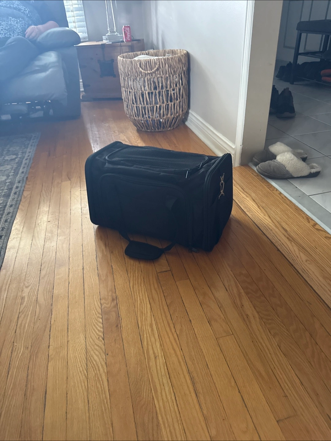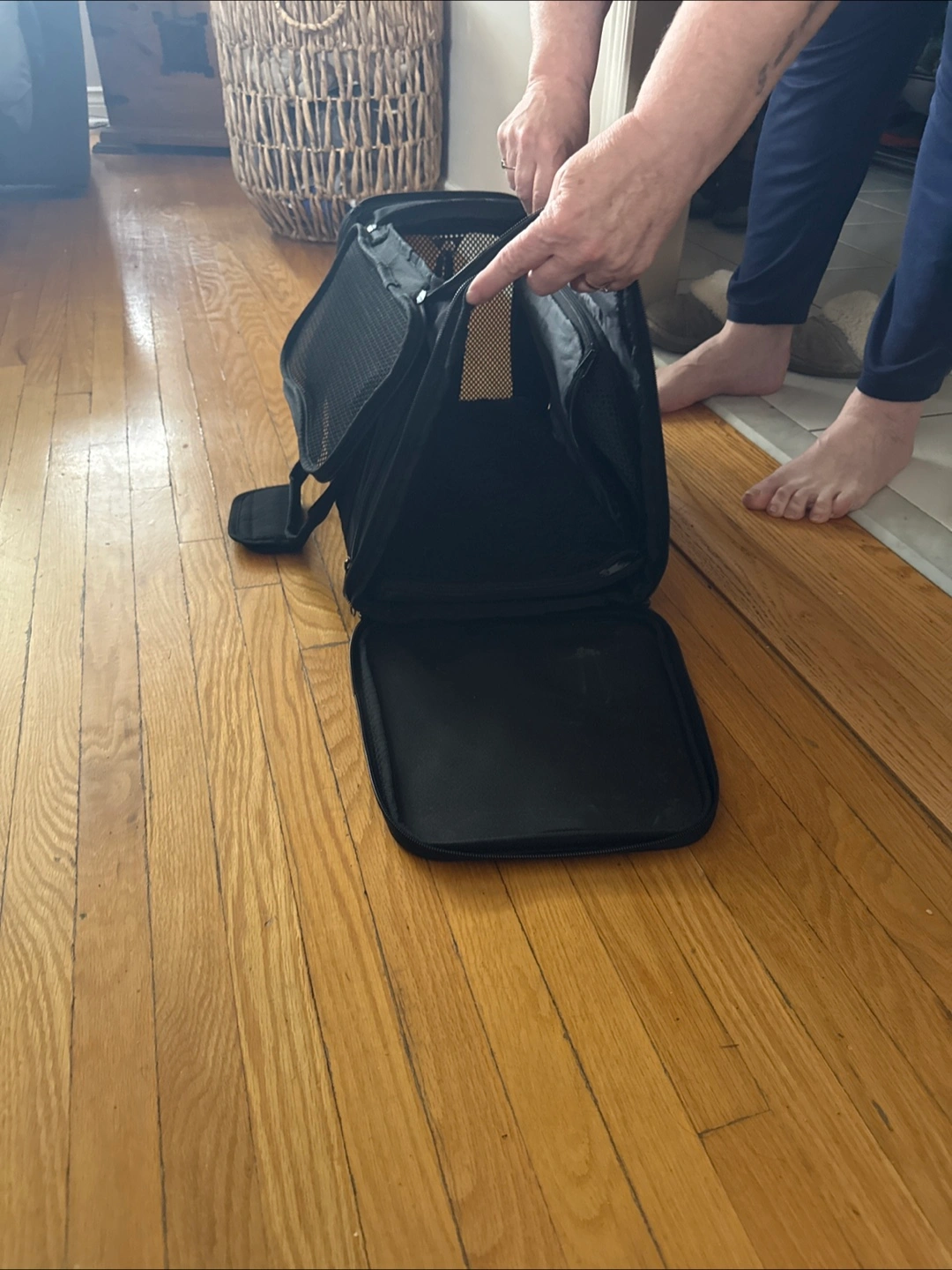 10Black pet carrier. Soft-sided carrier with mesh top. Perfect for small animals. Zipper closure and top handle and expandable