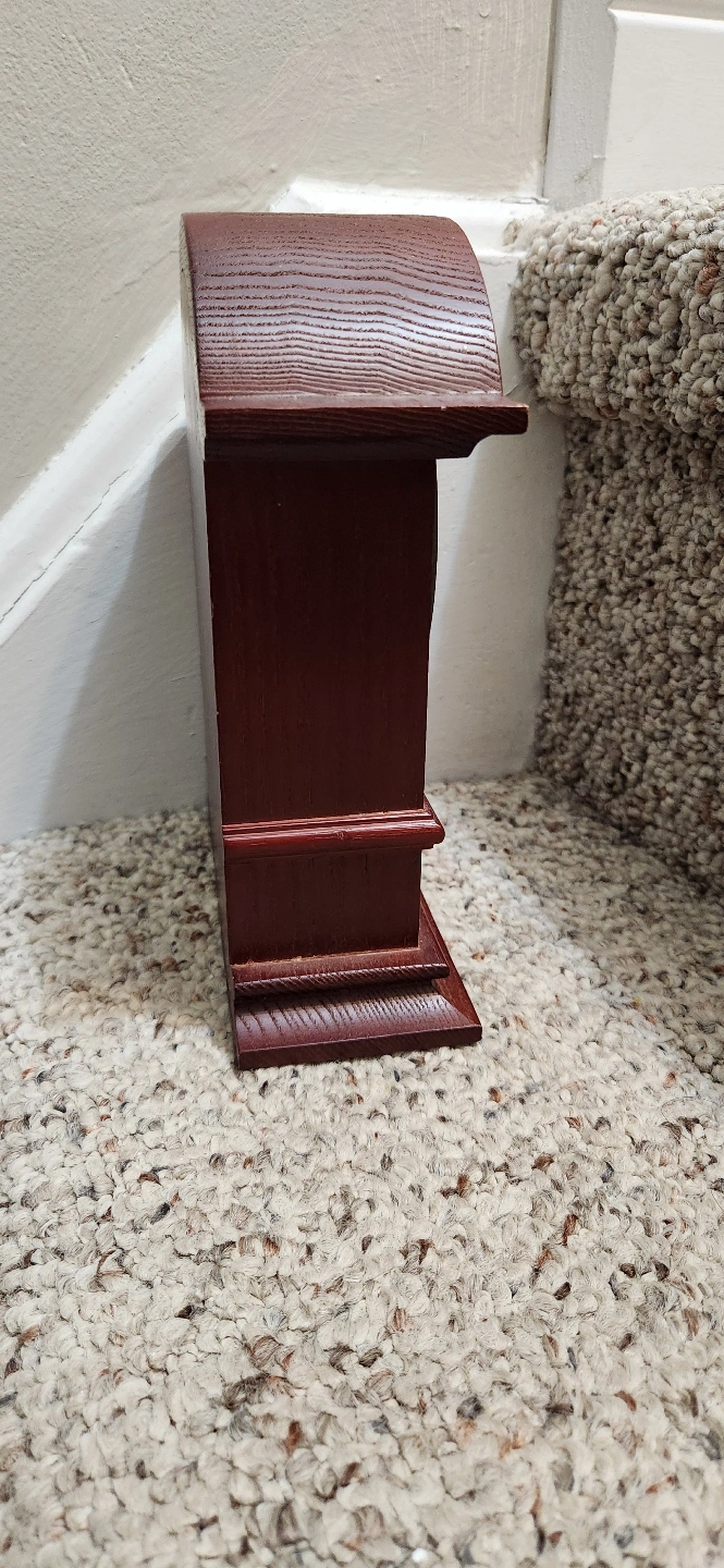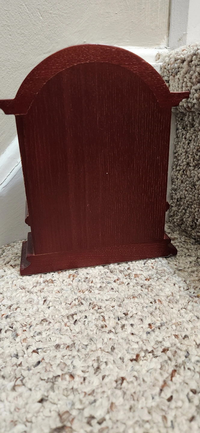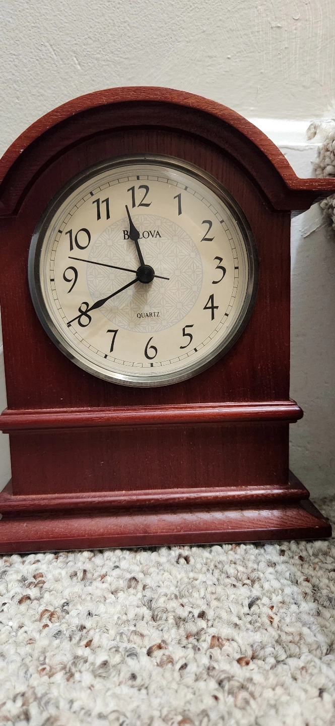 This is a used Bulova Quartz mantel clock with a beautiful wood finish, perfect for adding a touch of elegance to any room. The clock is in good condition and keeps accurate time. It's a charming piece that combines functionality with classic design.