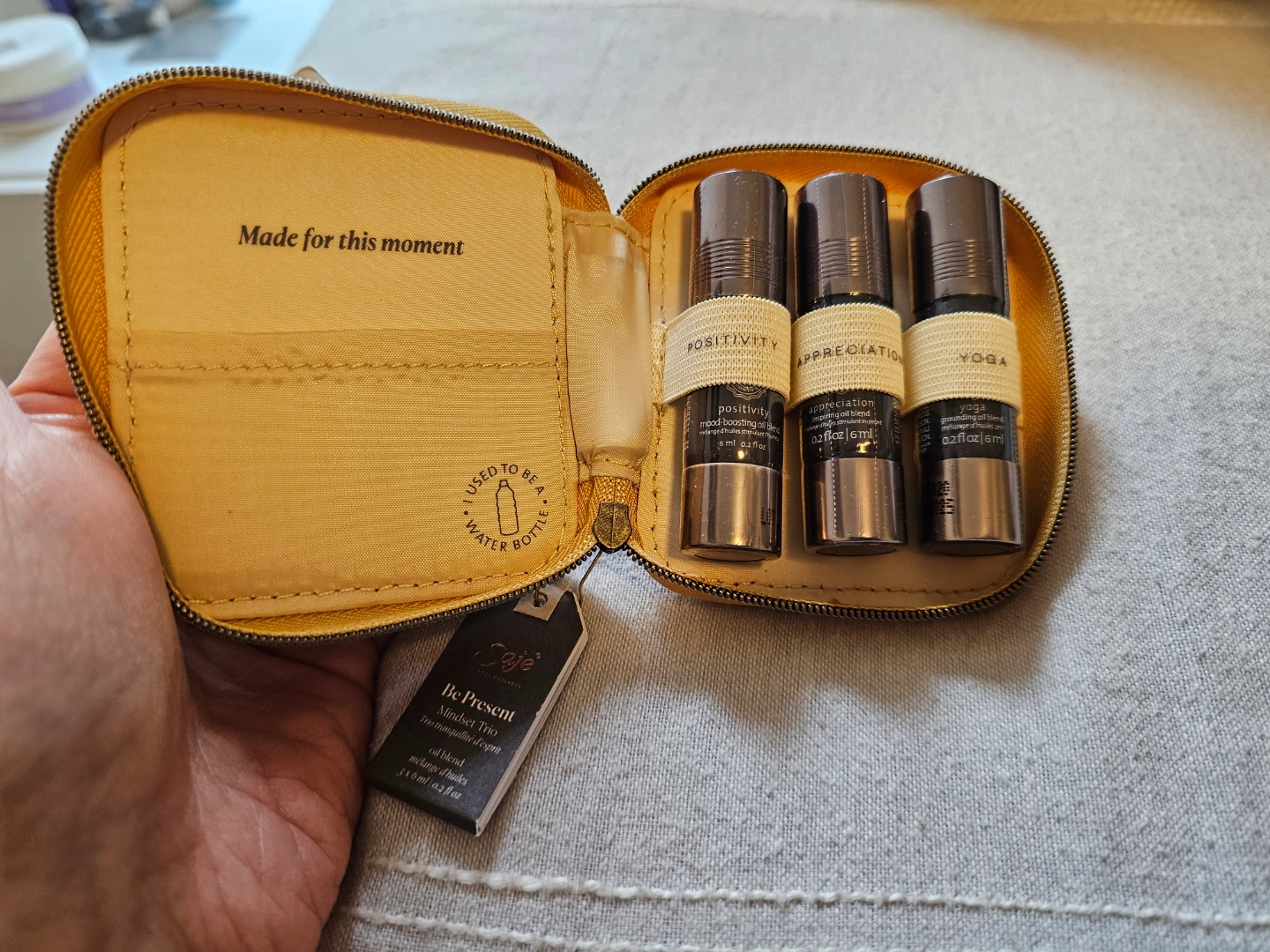 Mustard yellow canvas carrying case. Contains three 6 ml essential oil roll-ons- all sealed: Positivity, Appreciation, and Yoga. Perfect for travel.