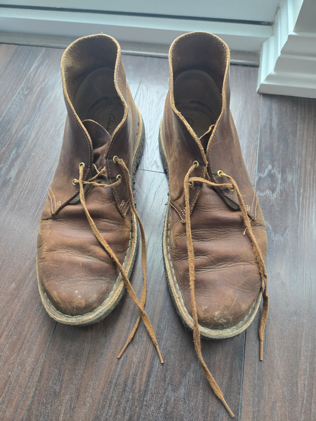 614Well-worn brown leather boots. Lace-up closure. With new laces and buff could look a lot better