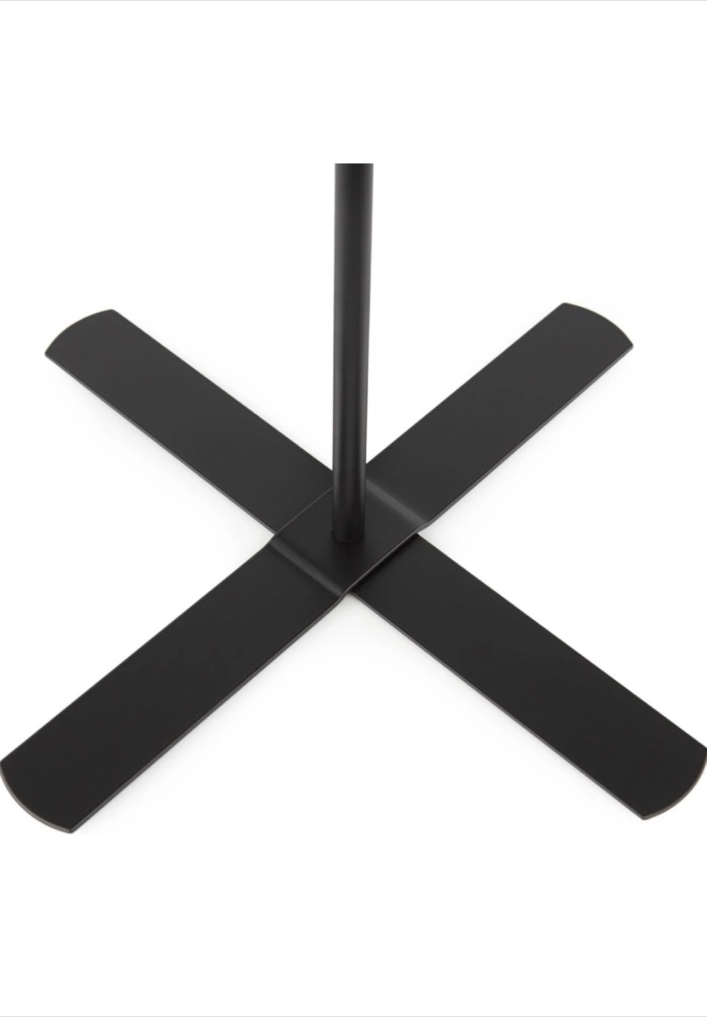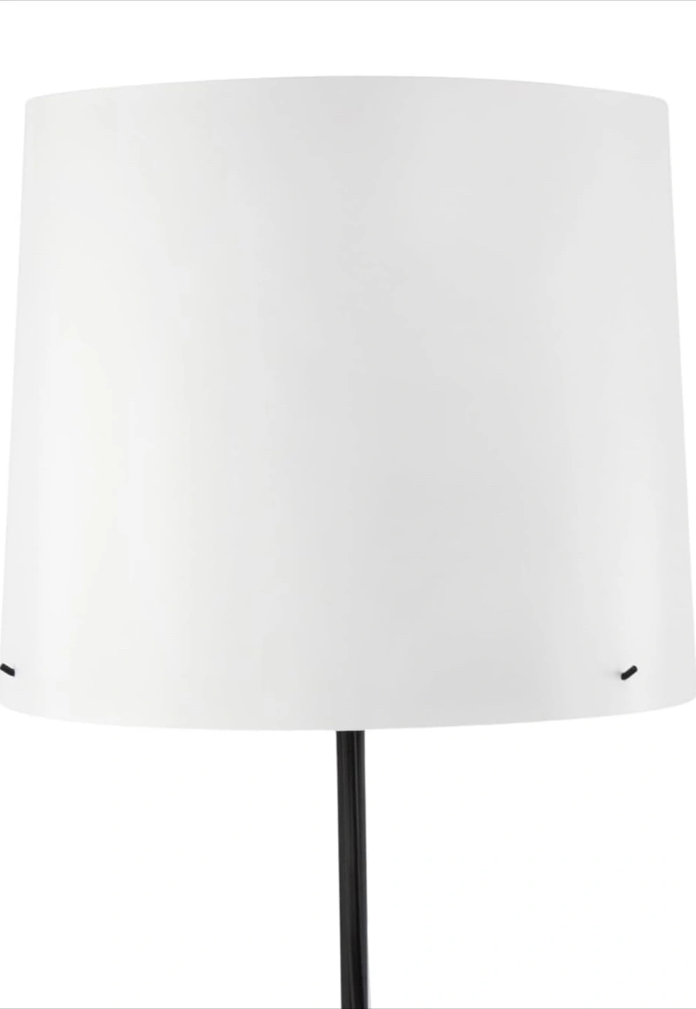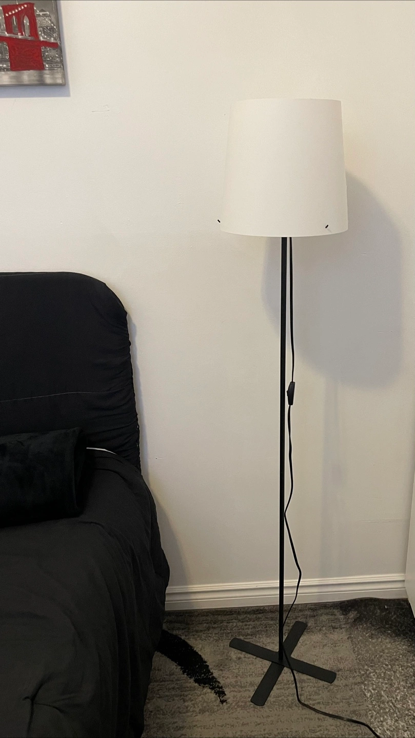 Tall black metal floor lamp. Simple design. White fabric shade. In-line switch on cord. Cross base for stability.