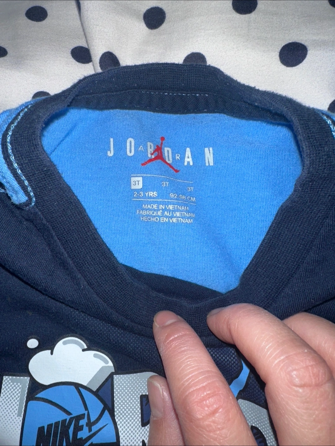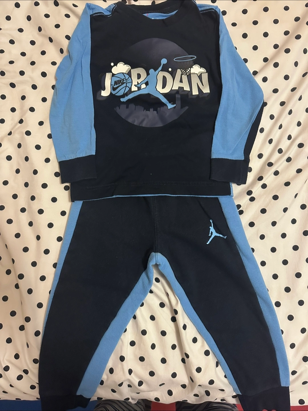 Two-piece toddler outfit. Blue and navy long-sleeve shirt and matching pants. Features Jordan branding. Size 3T.
