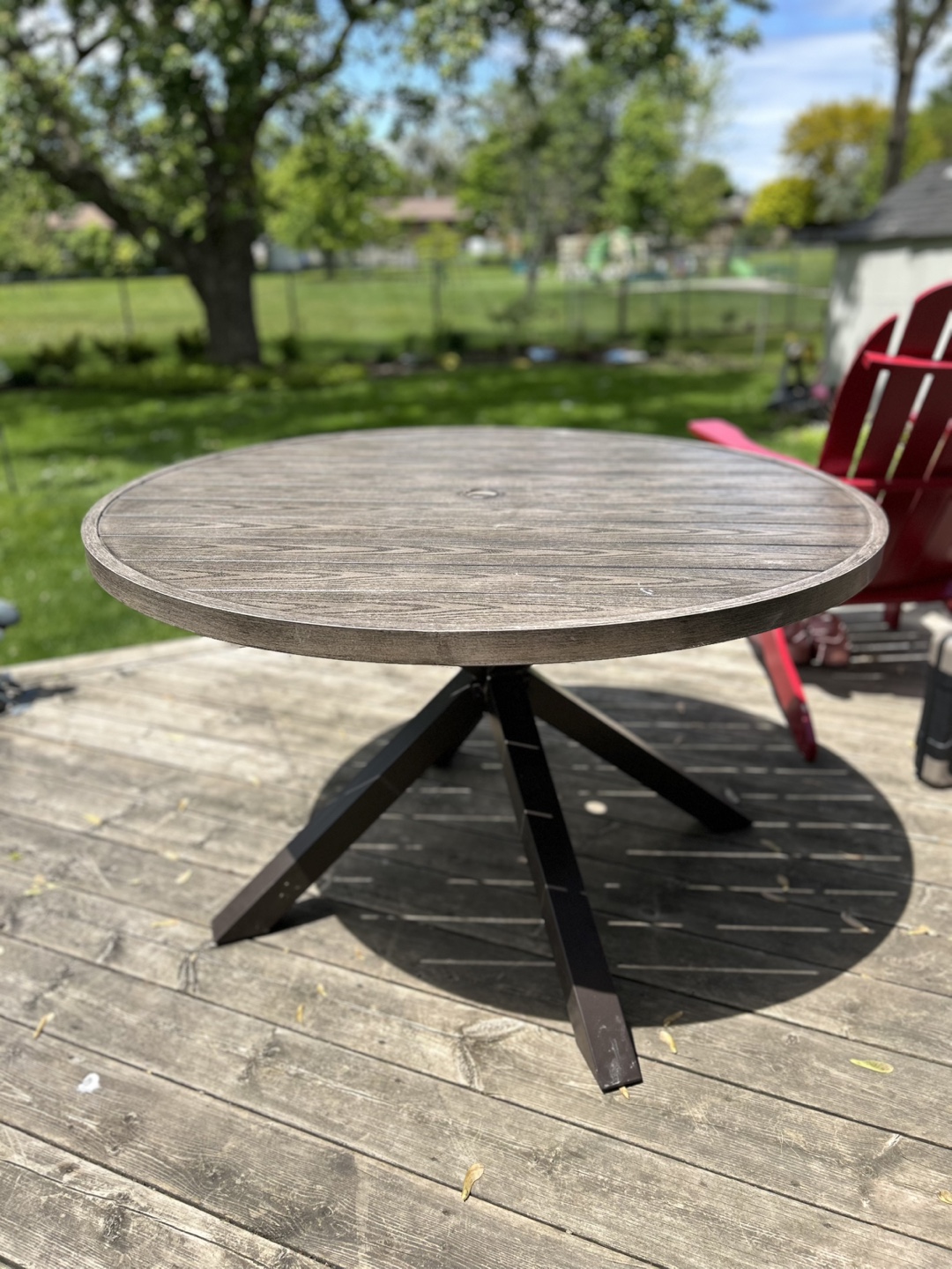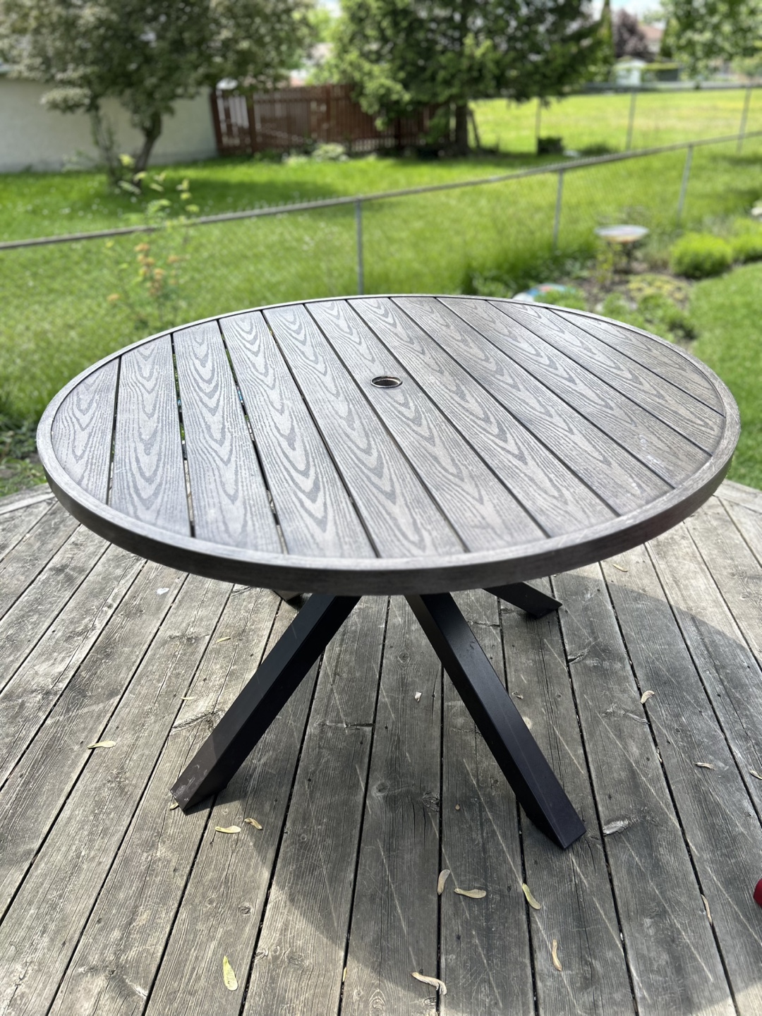 Round outdoor patio table. Grayish metal “wood-look” tabletop with metal legs. Umbrella hole in centre.