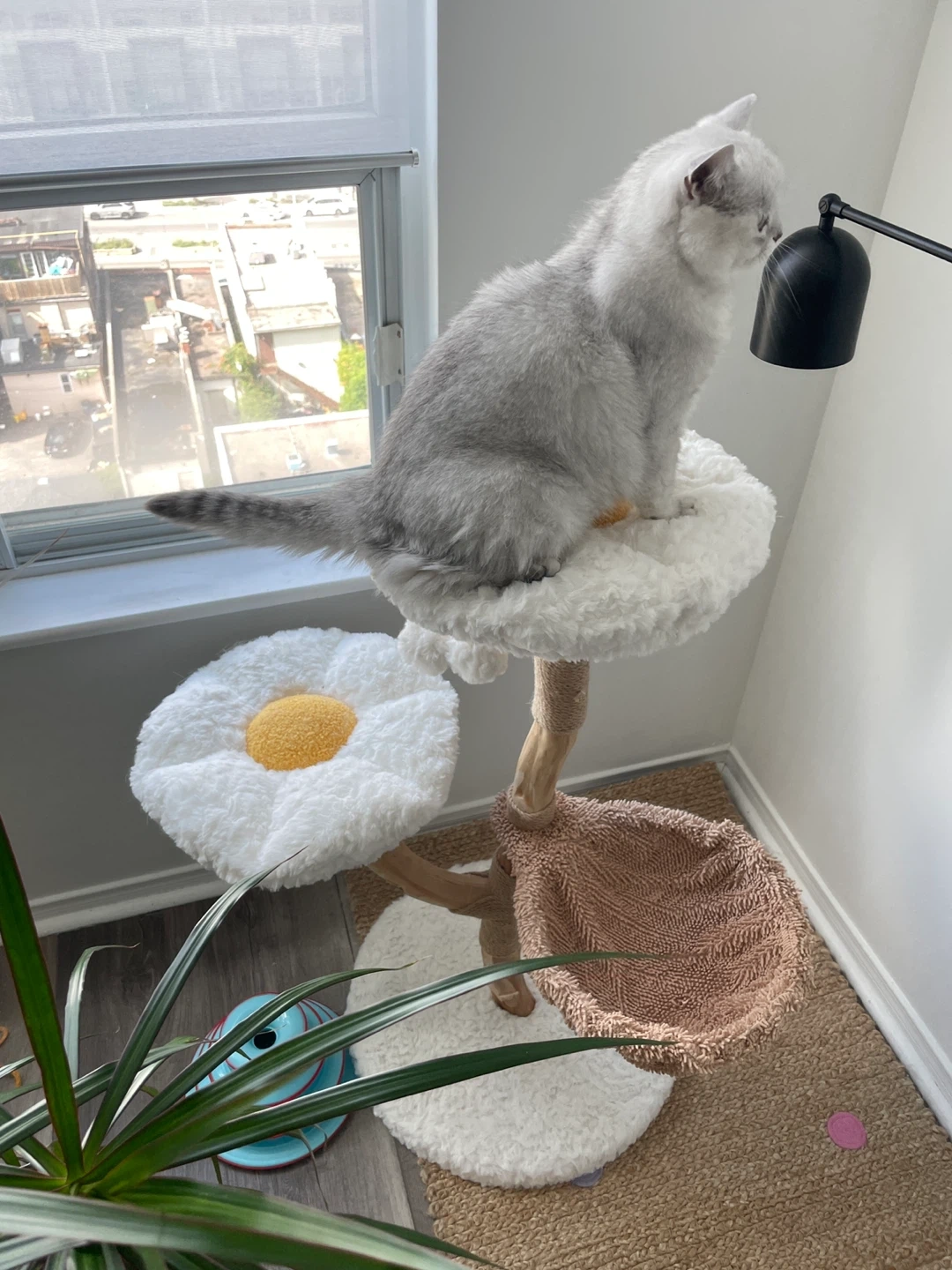 Unique cat tree, handmade. Features two fluffy daisy-shaped platforms and a cozy bowl-shaped bed. Natural wood post with jute rope. Perfect for playful cats. Includes hanging pom-poms. Pickup only.