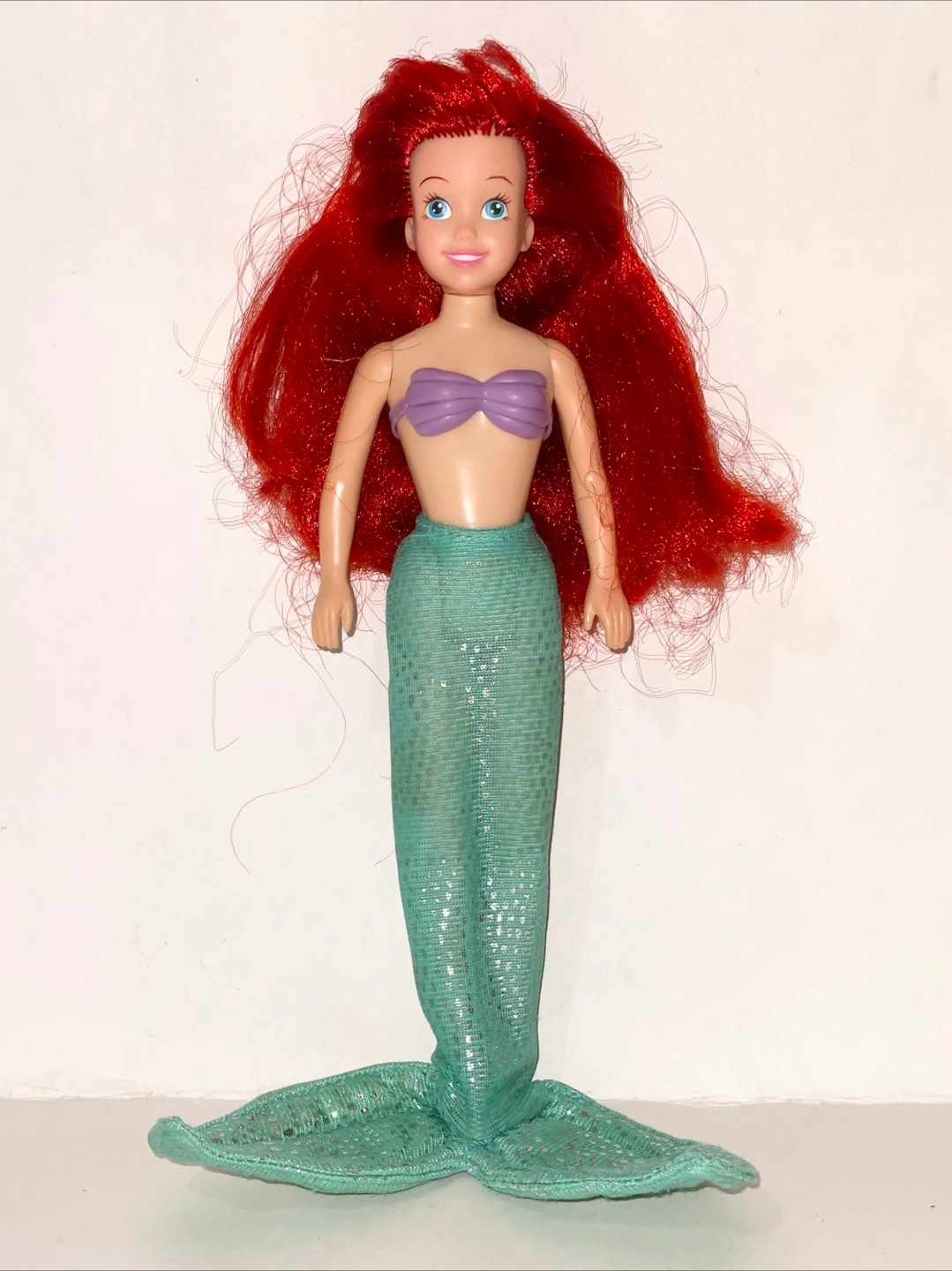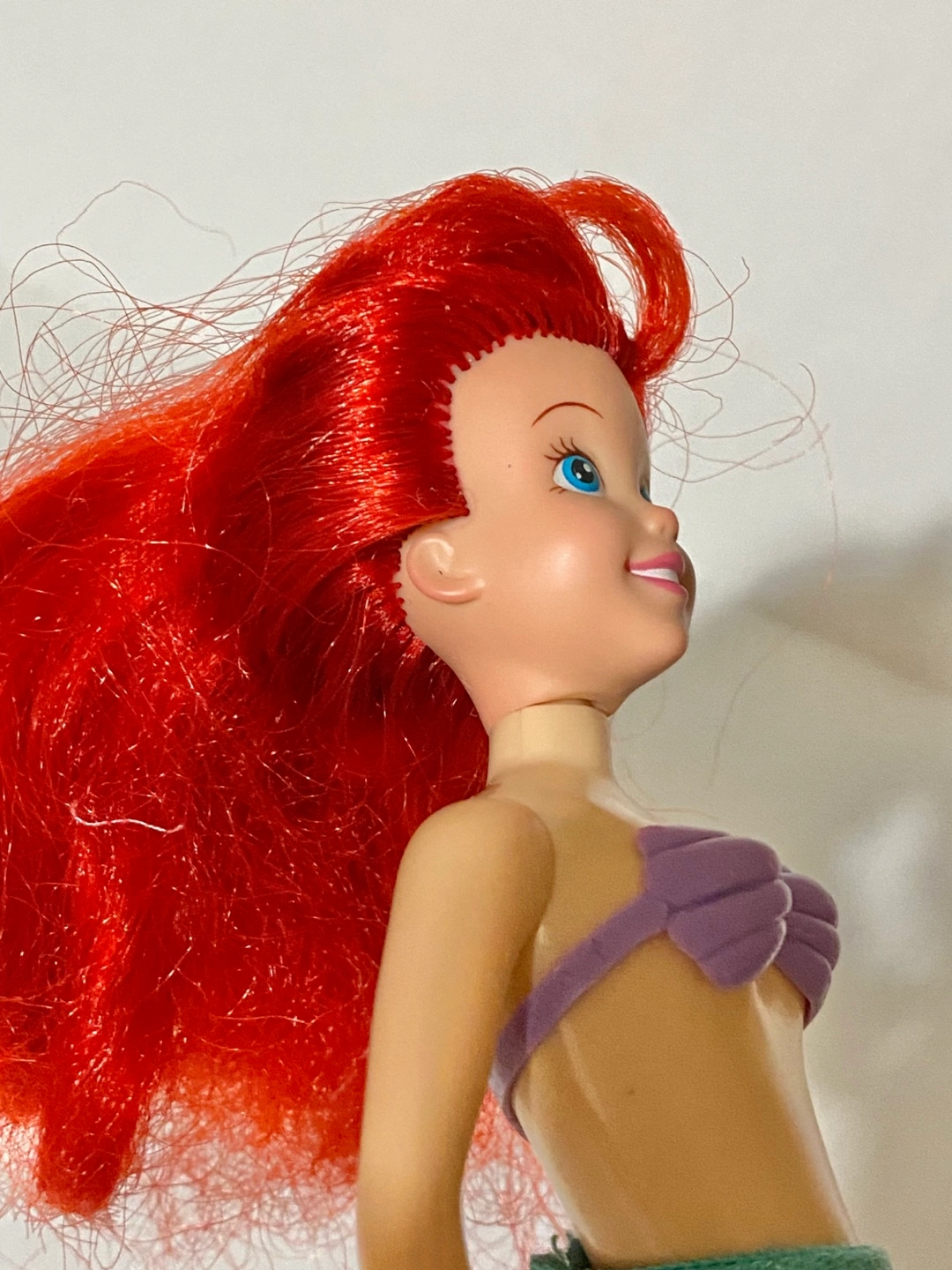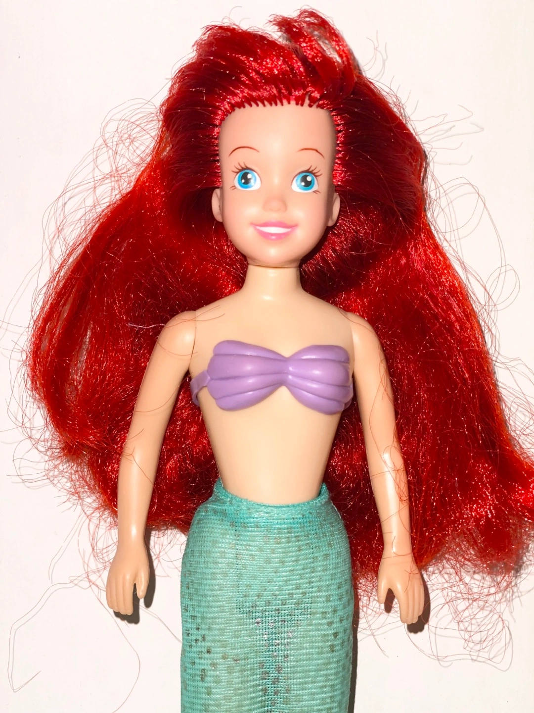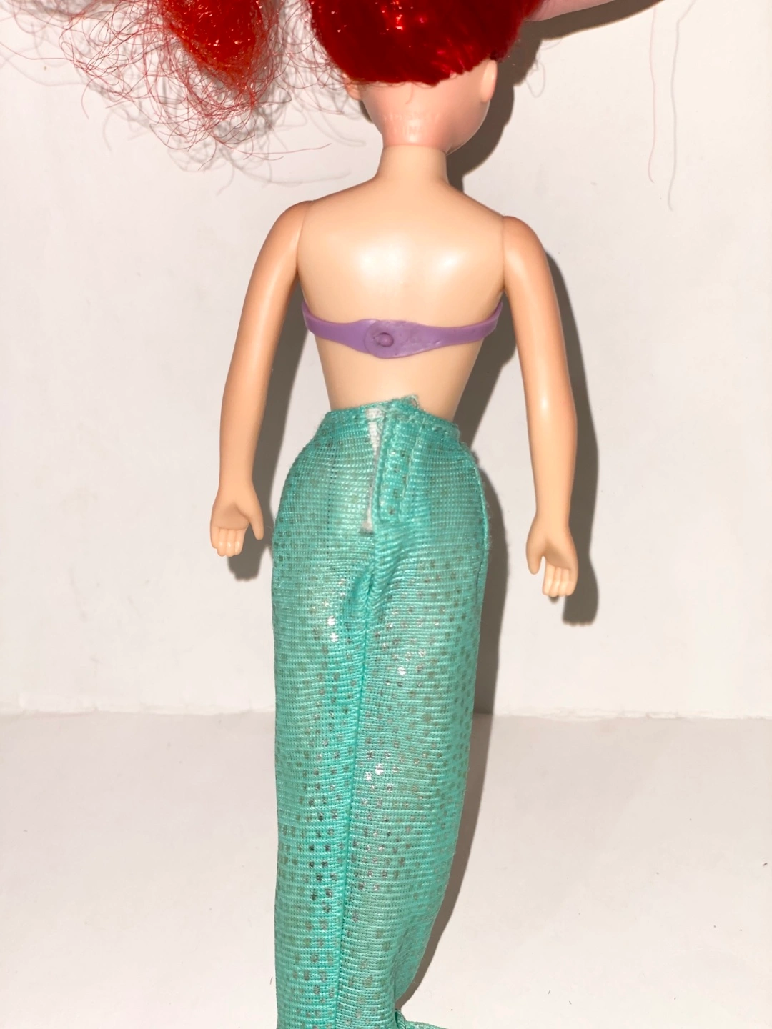 Pre-owned vintage Ariel doll. Long red hair. Teal sparkly tail. Purple seashell top. Collectible.