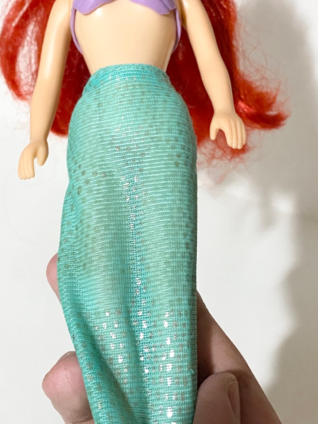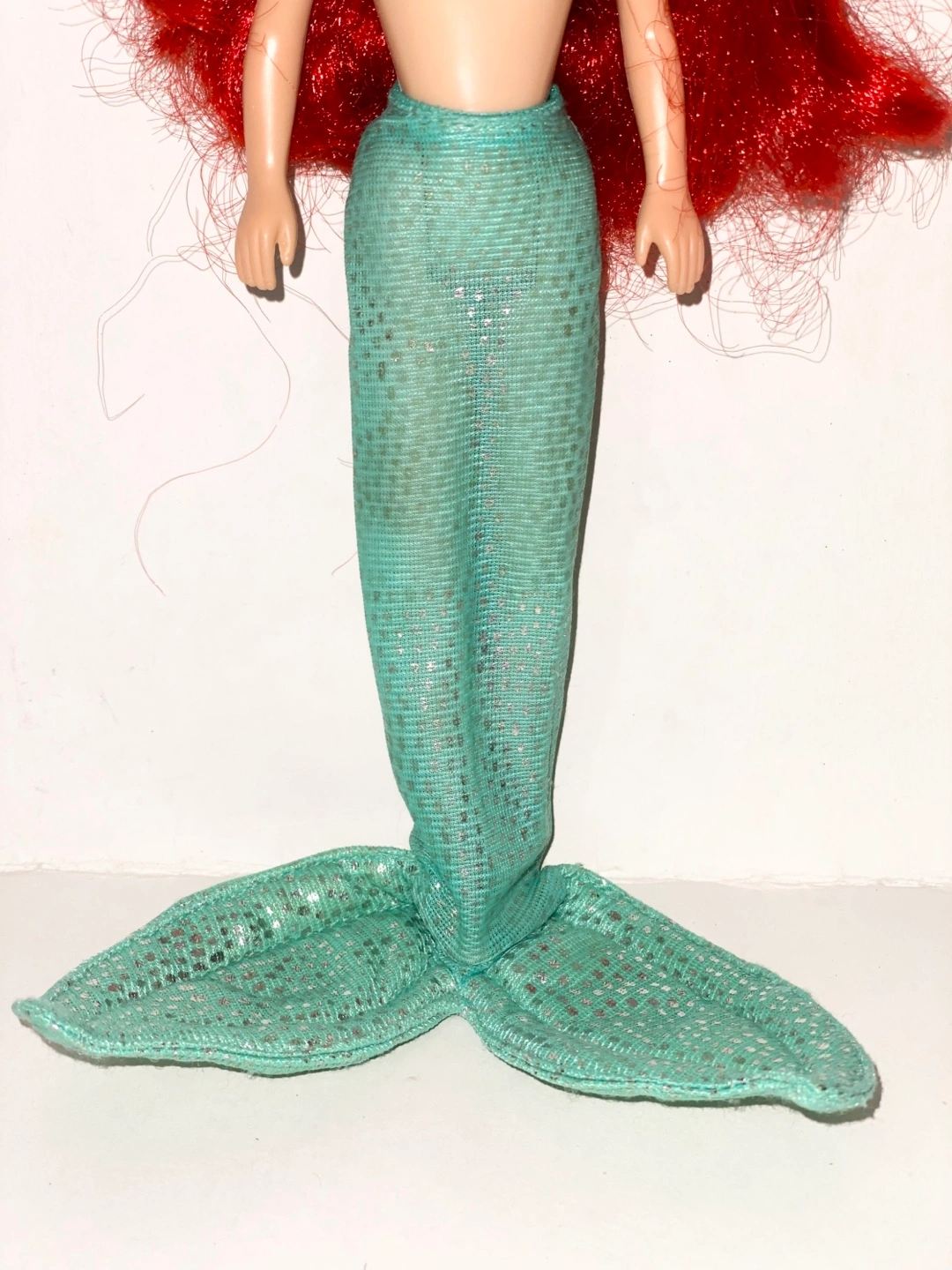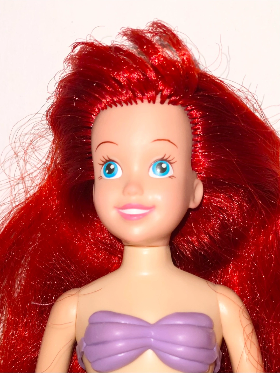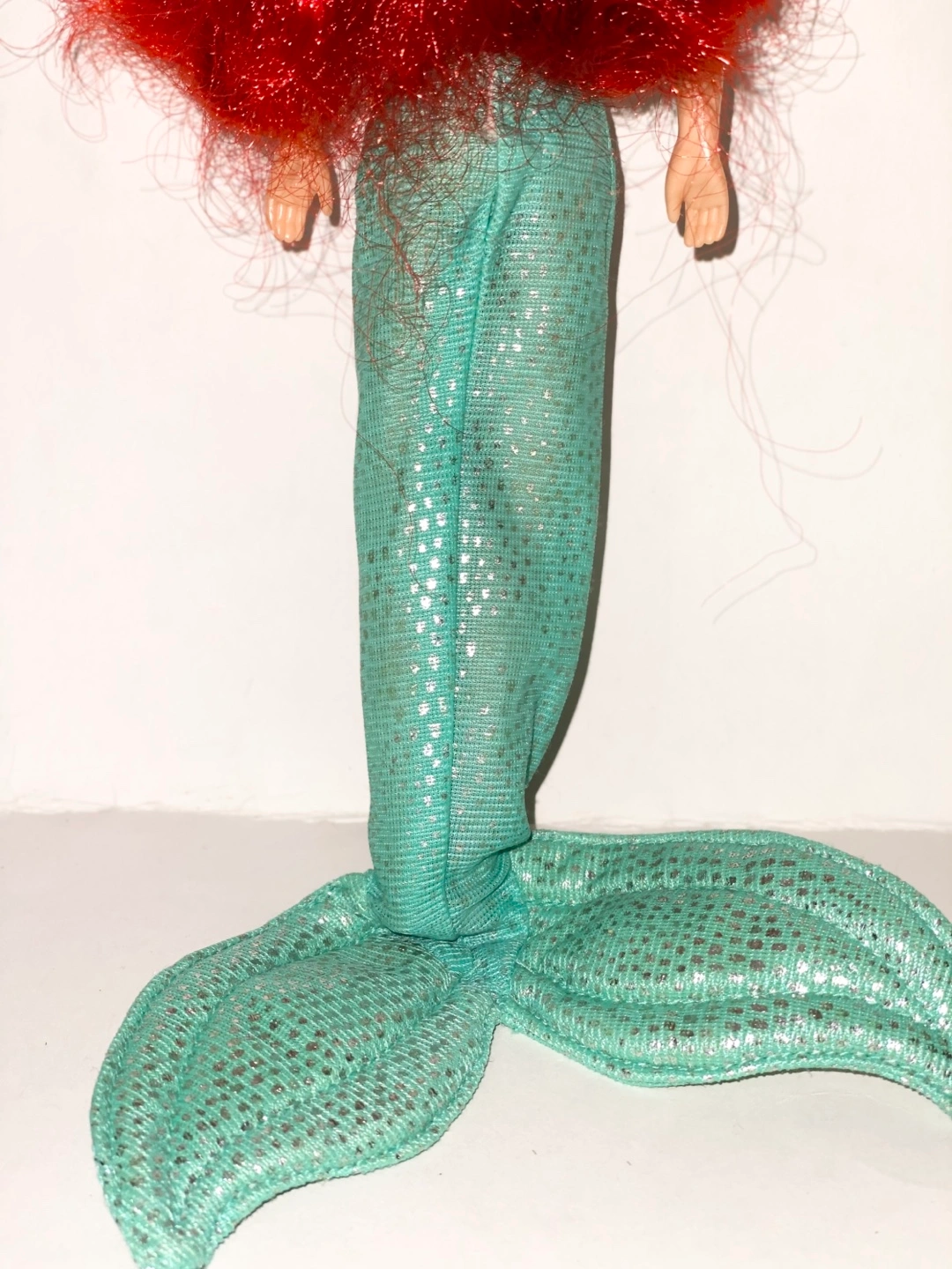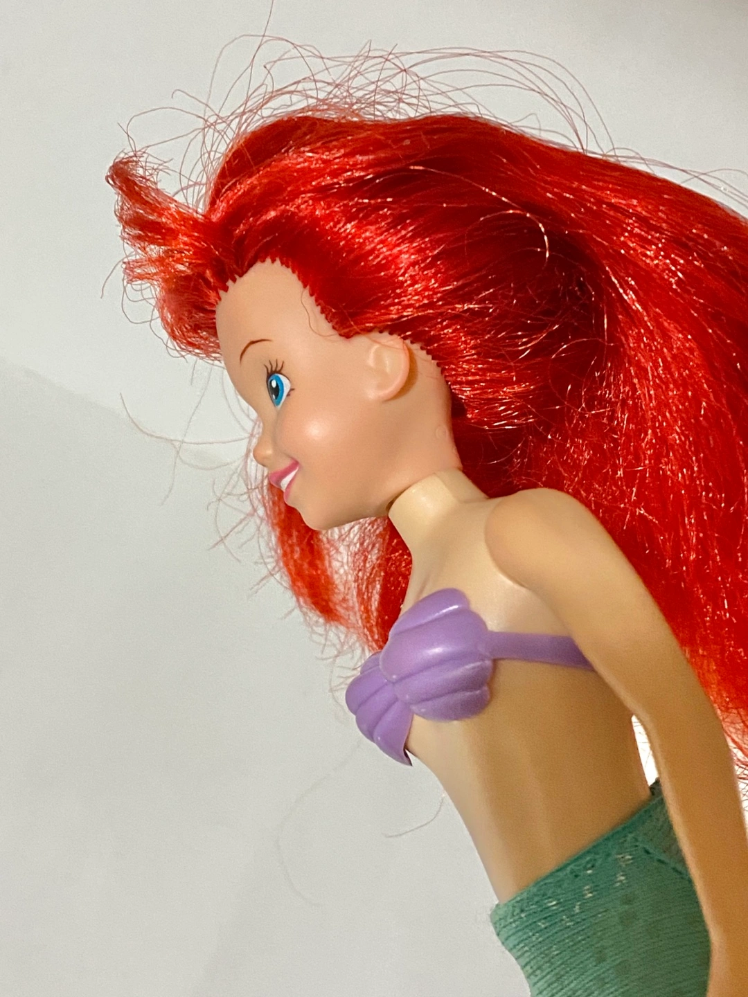 Pre-owned vintage Ariel doll. Long red hair. Teal sparkly tail. Purple seashell top. Collectible.