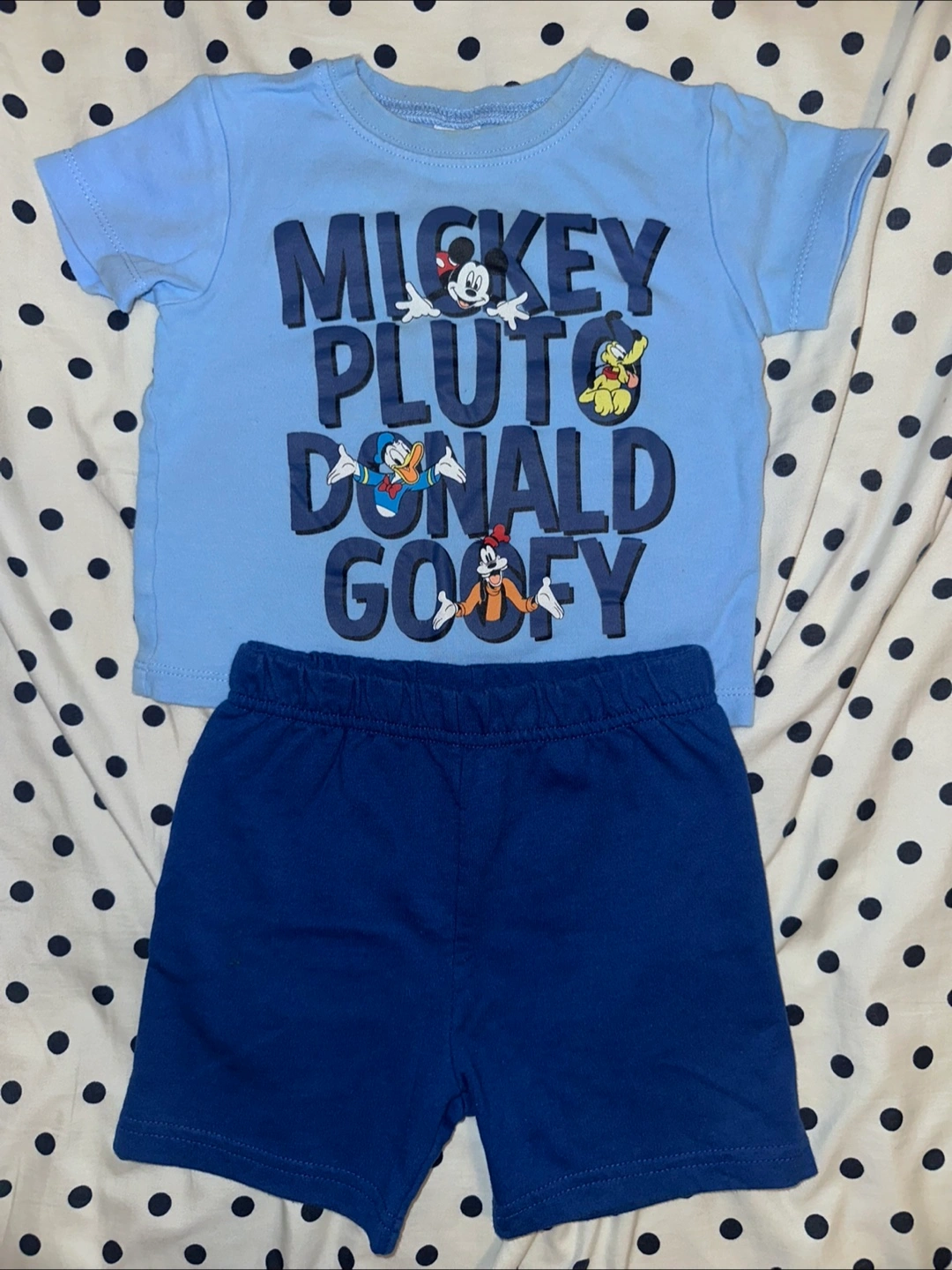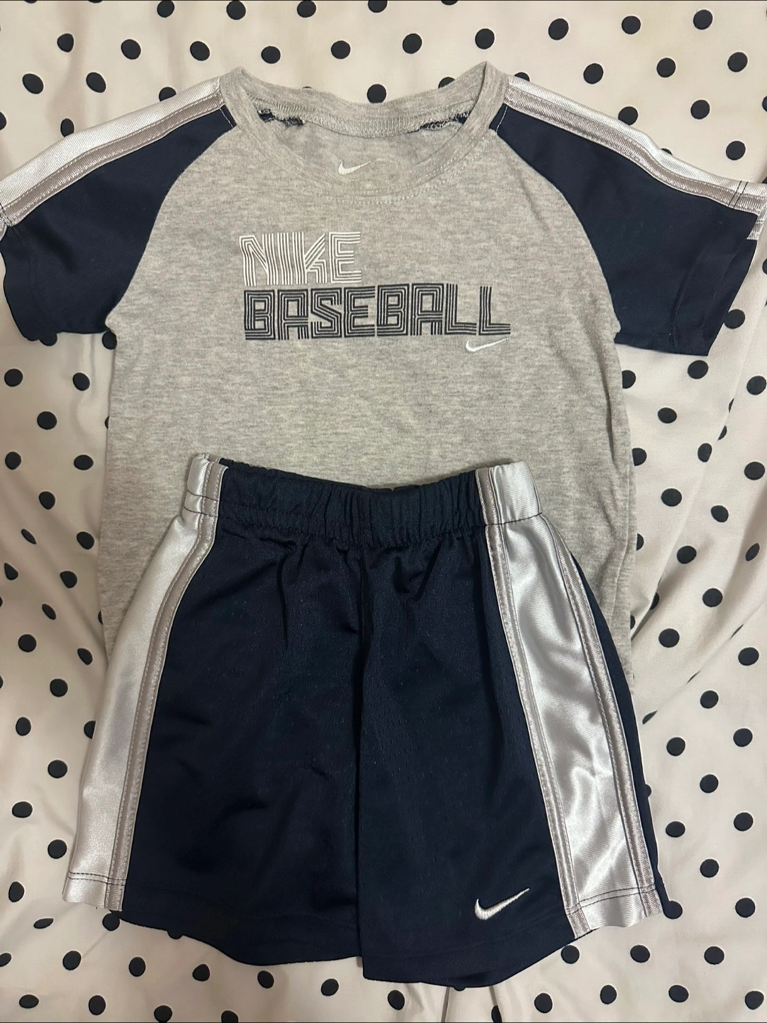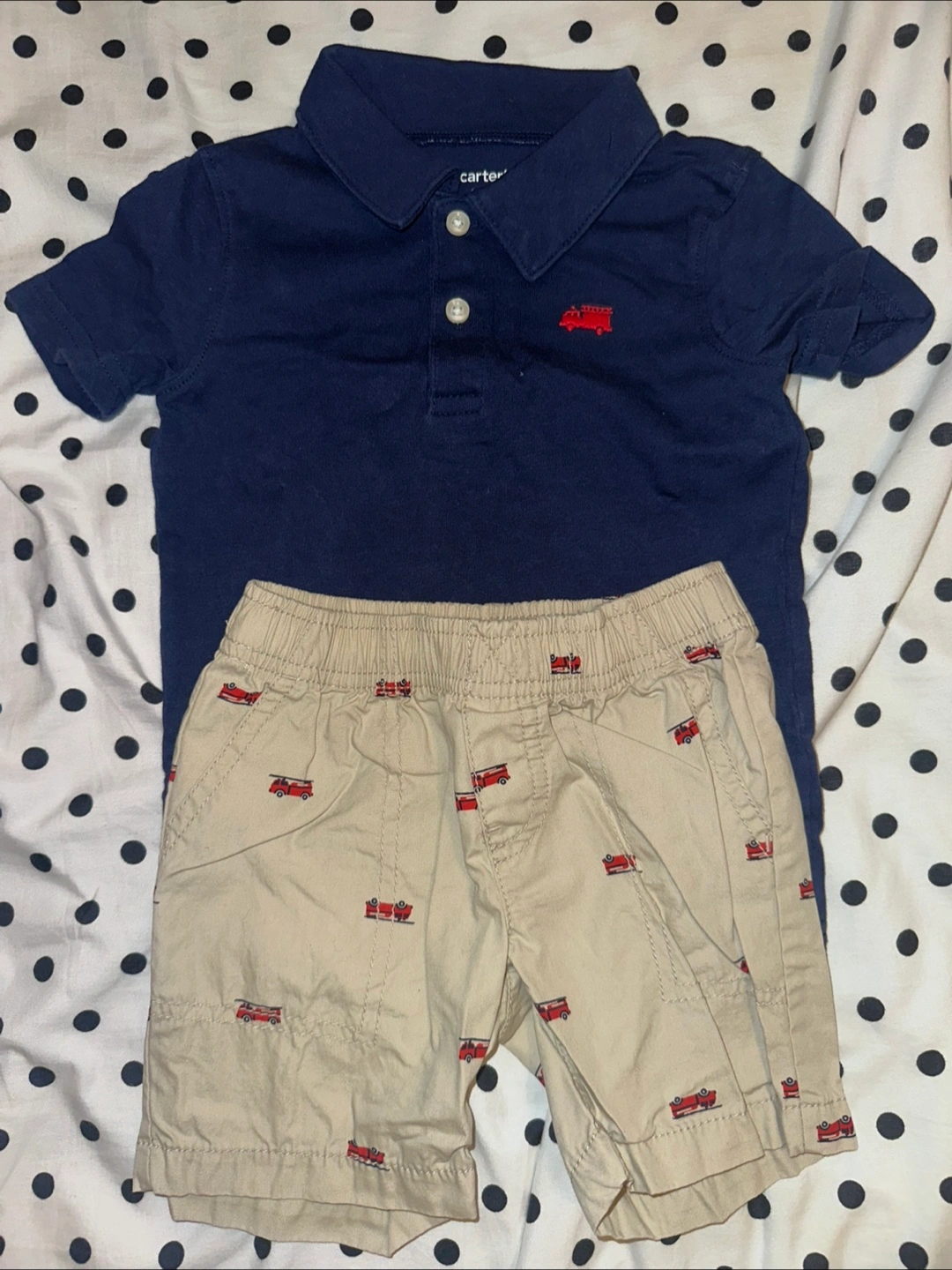 Adorable bundle including two outfits. One features a light blue Mickey Mouse shirt and navy shorts. The other is a grey Nike baseball shirt and black shorts with silver accents. Also included is a Carter's navy polo shirt and khaki shorts with firetruck print. Great condition. Sizes vary.