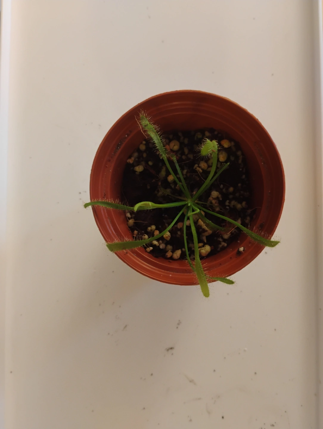 Sundew Capensis carnivorous plant in a 3" pot. Will catch and digest small insects. Easy to care for and great for beginners.