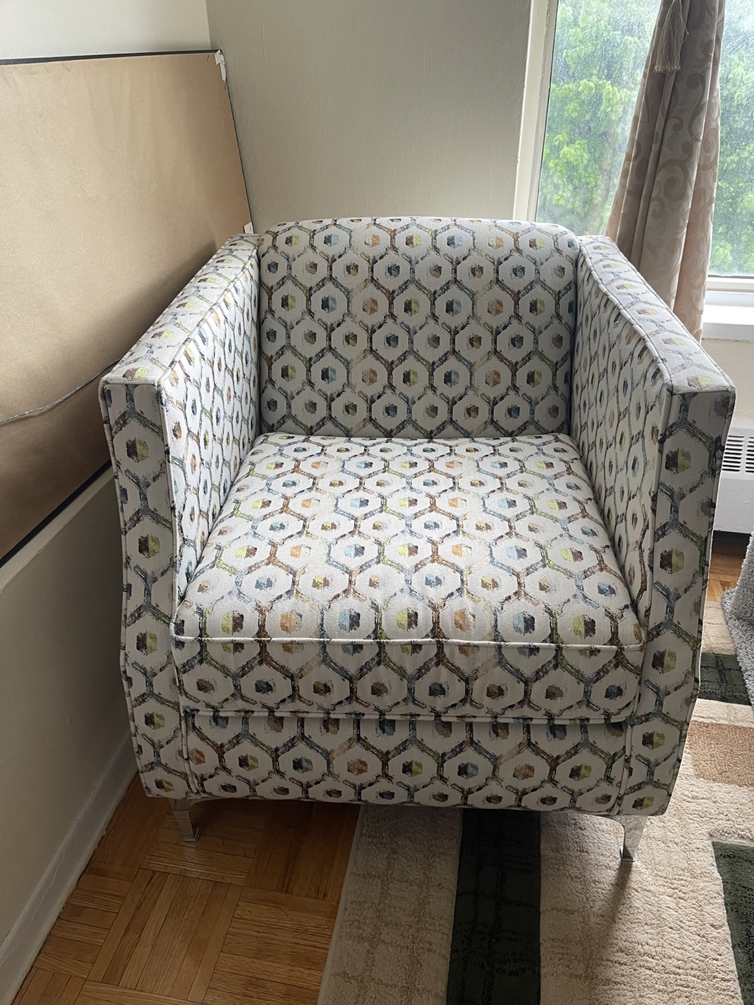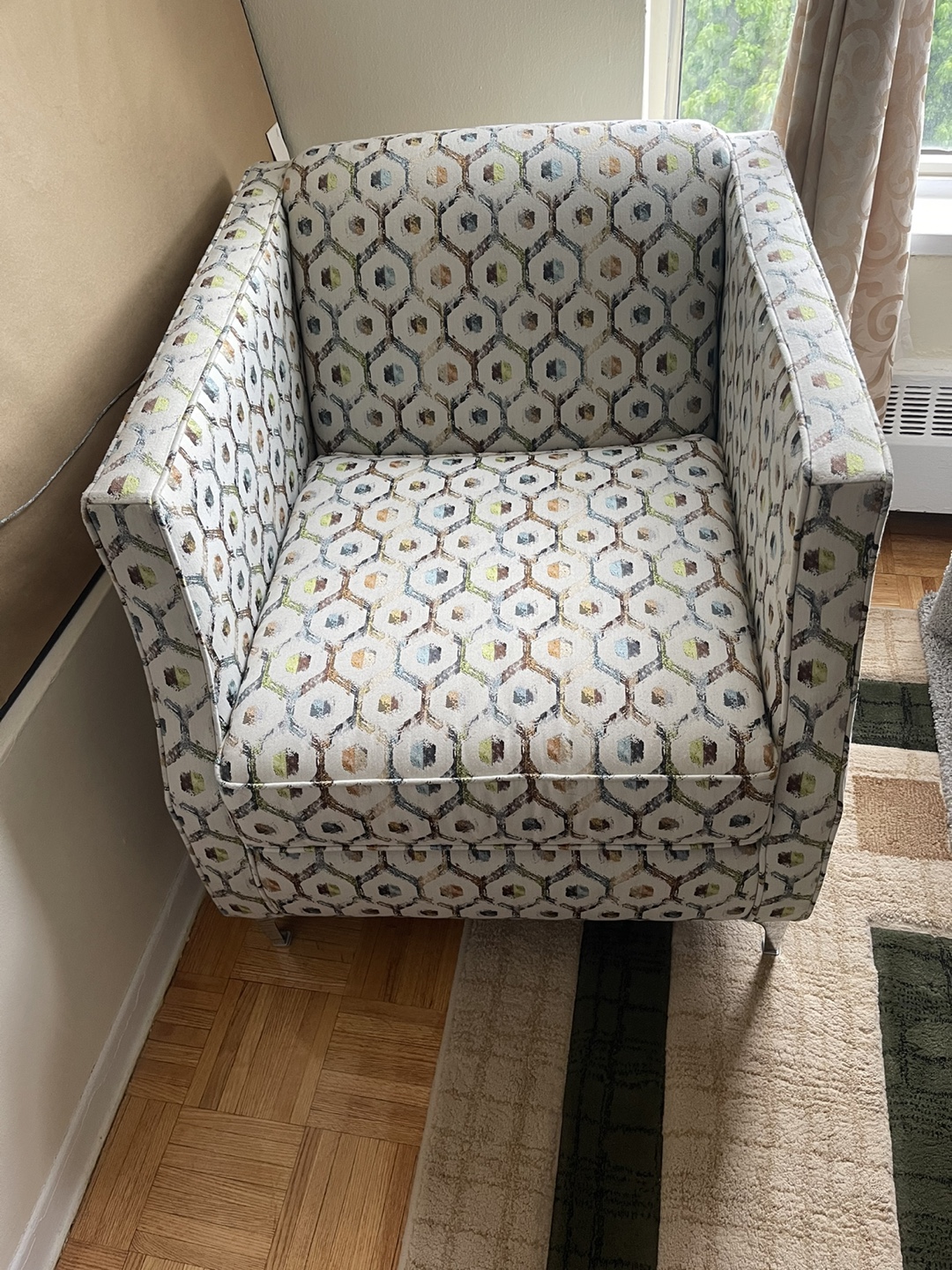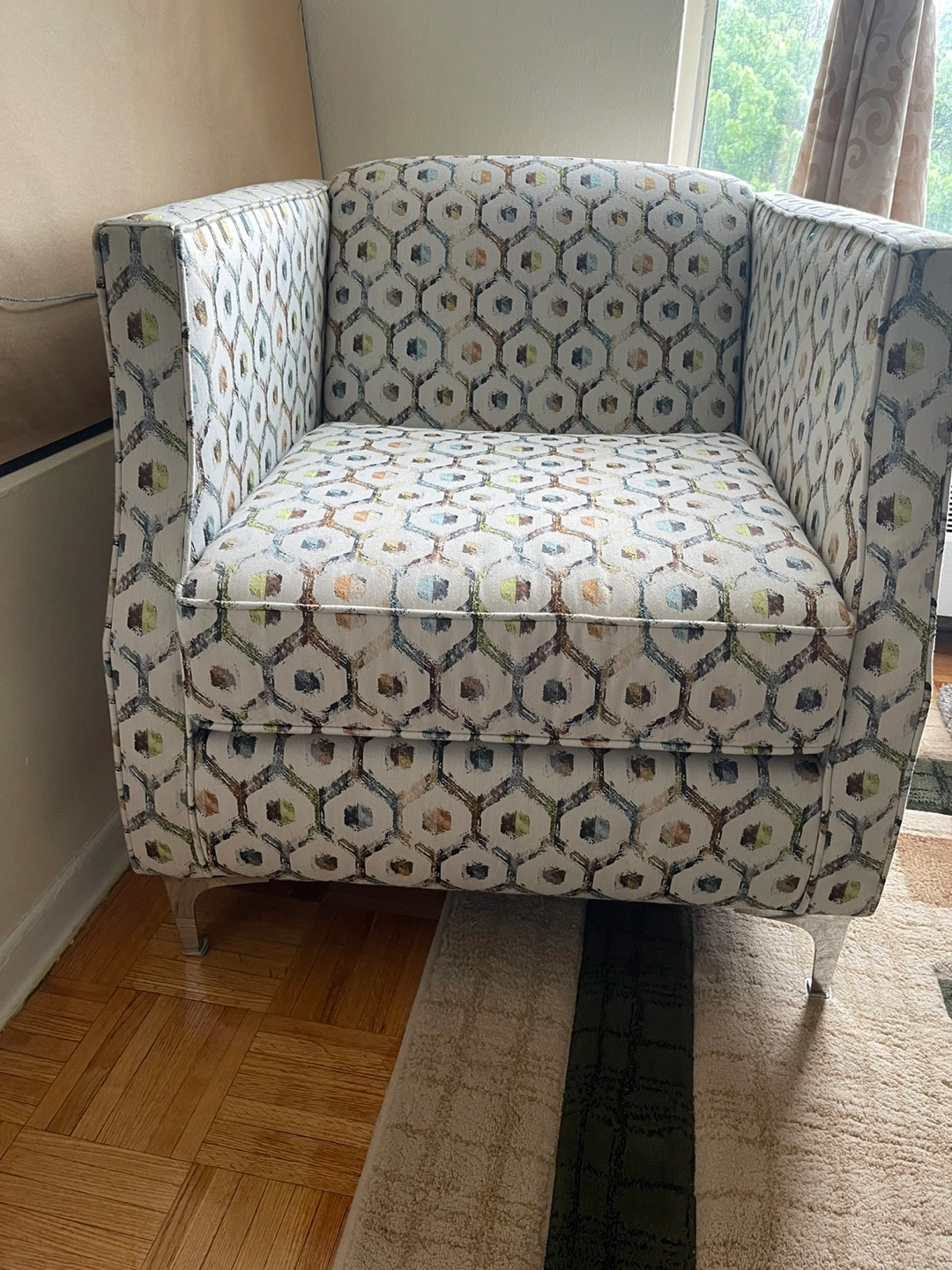 Comfortable armchair, unique geometric design. Neutral colours, silver legs. Perfect for living room or bedroom.