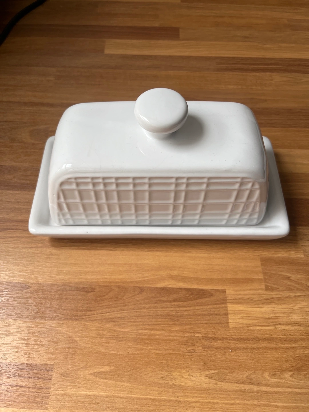Cute white ceramic butter dish. Features a grid pattern. Includes a separate dish and lid. Perfect for any kitchen decor.