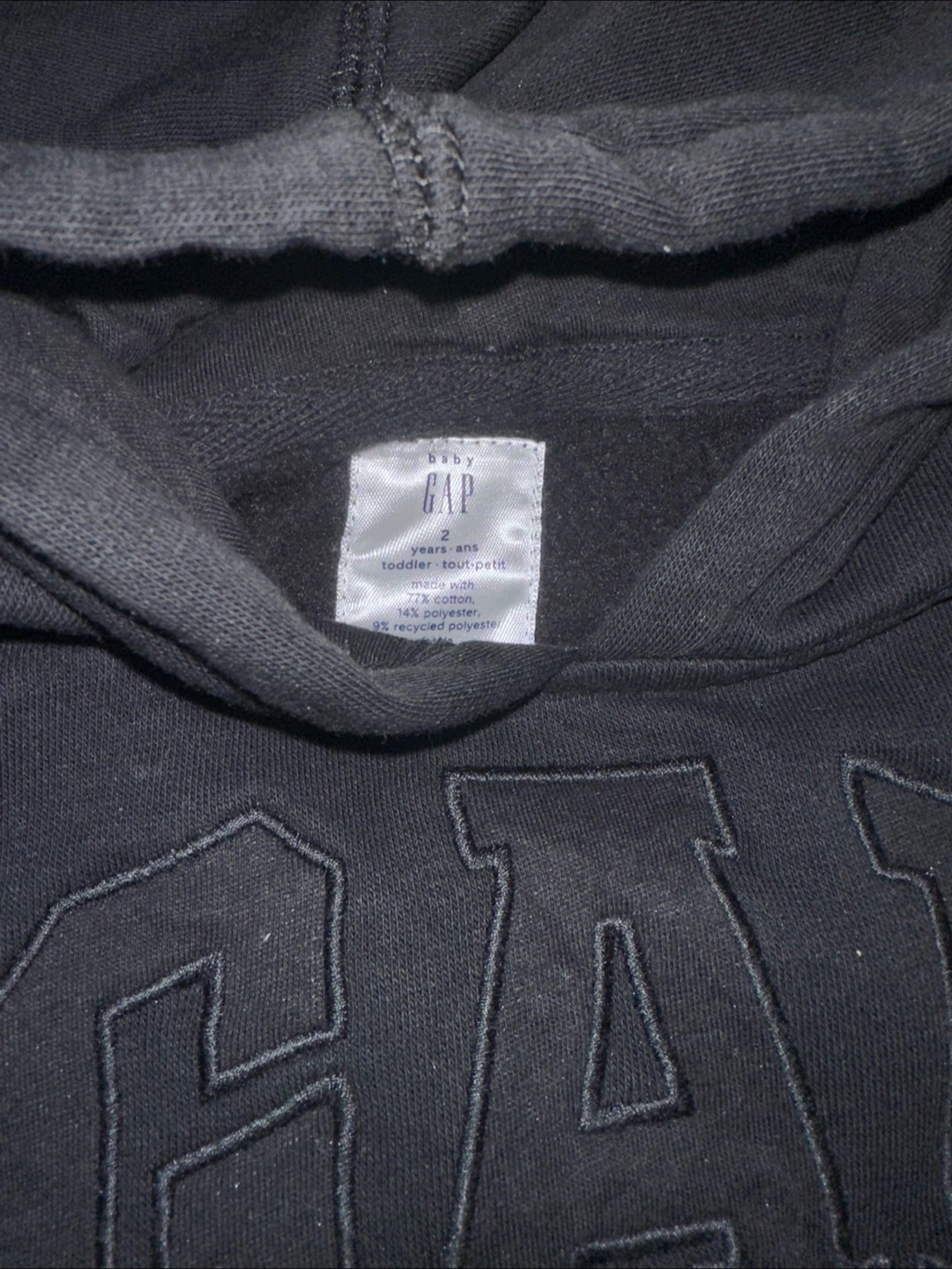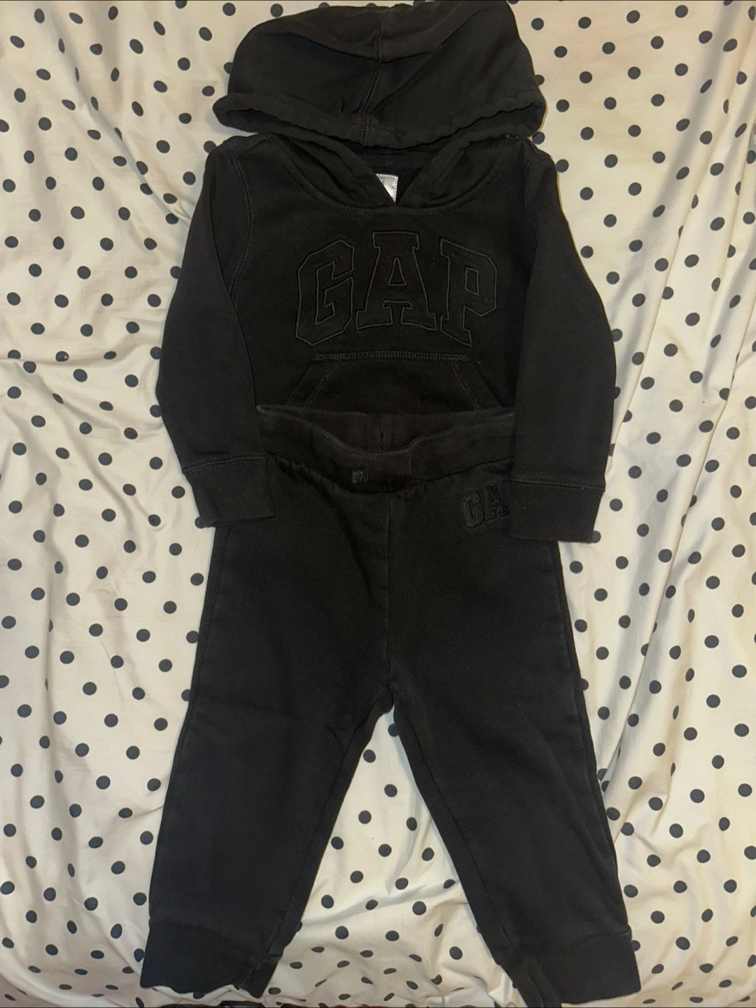 Almost hardly used adorable baby Gap tracksuit. Size 2T. Black hoodie and matching joggers. Soft cotton blend. Perfect for lounging or playing.