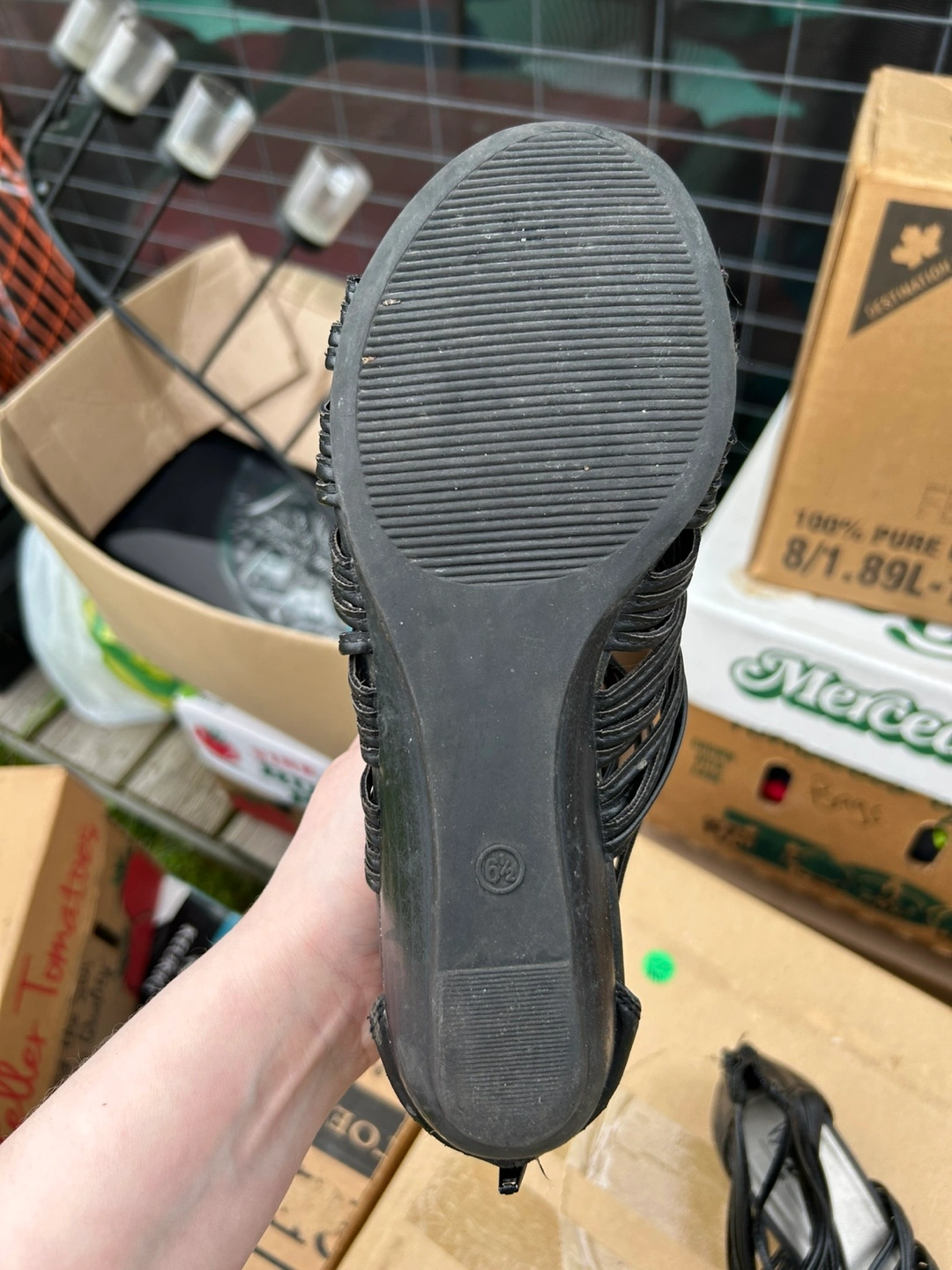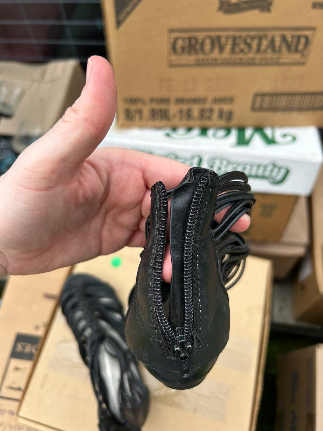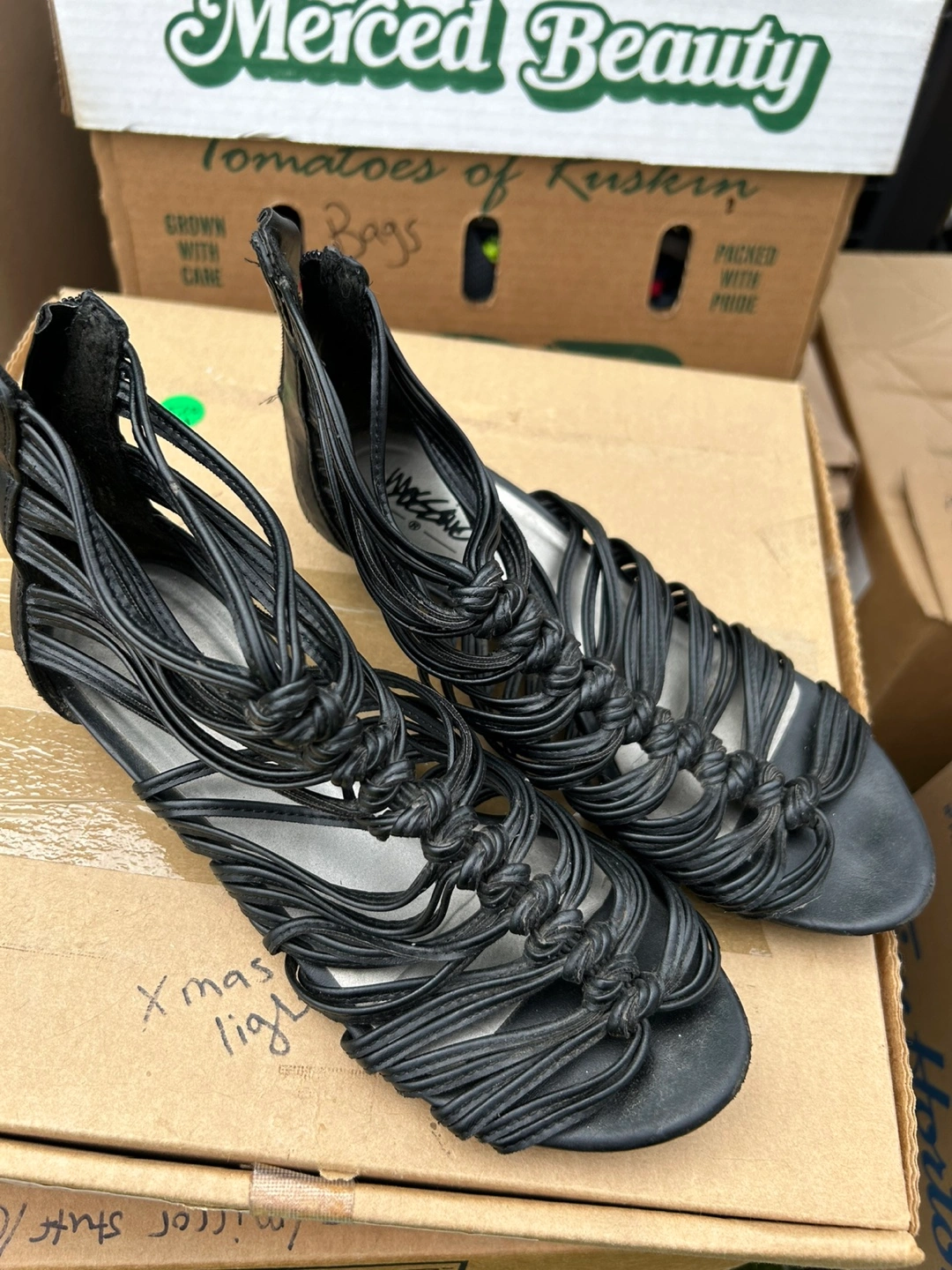 Black faux leather gladiator sandals. Features woven straps and a back zipper. Low wedge heel. Size 6.5