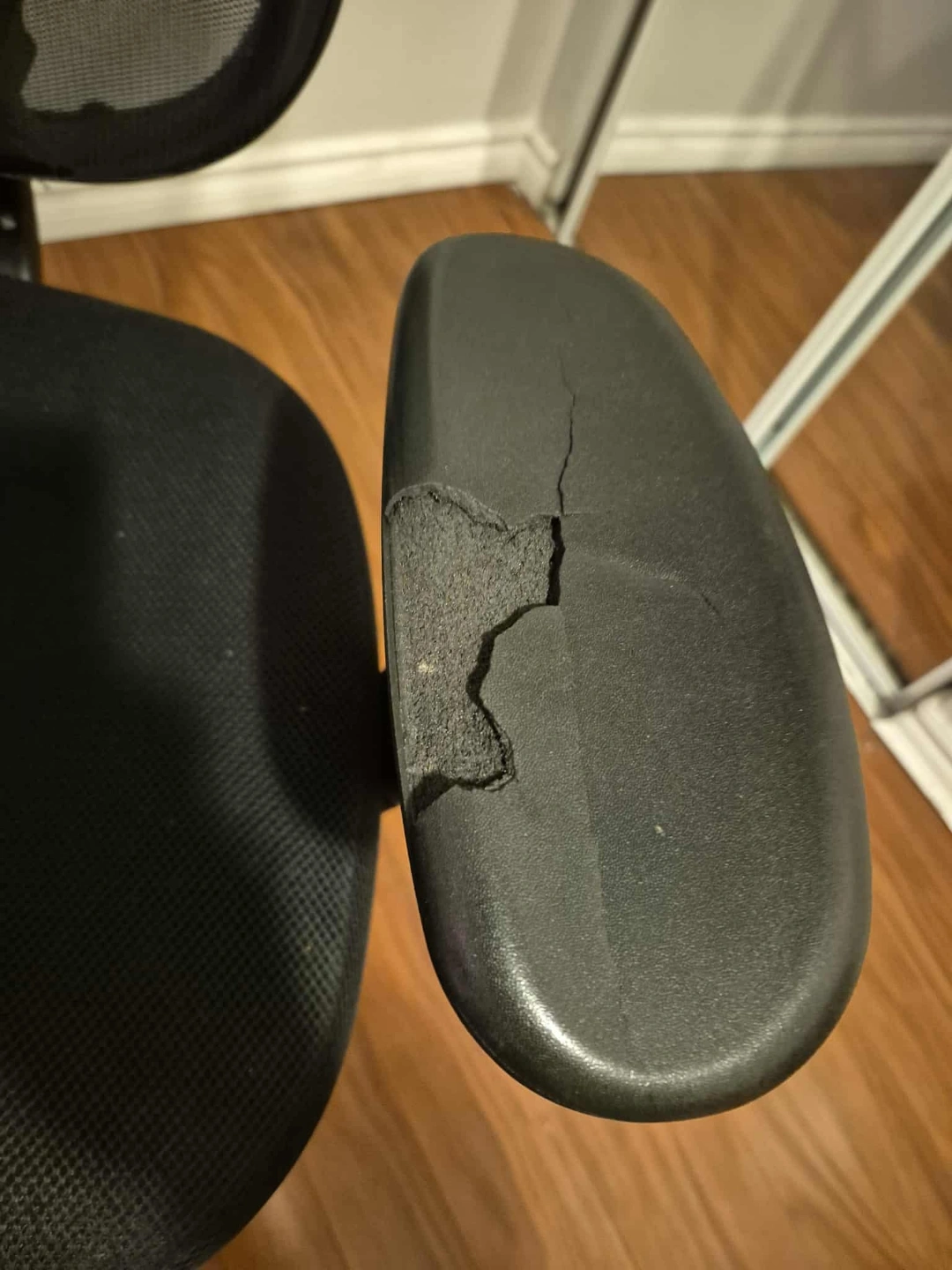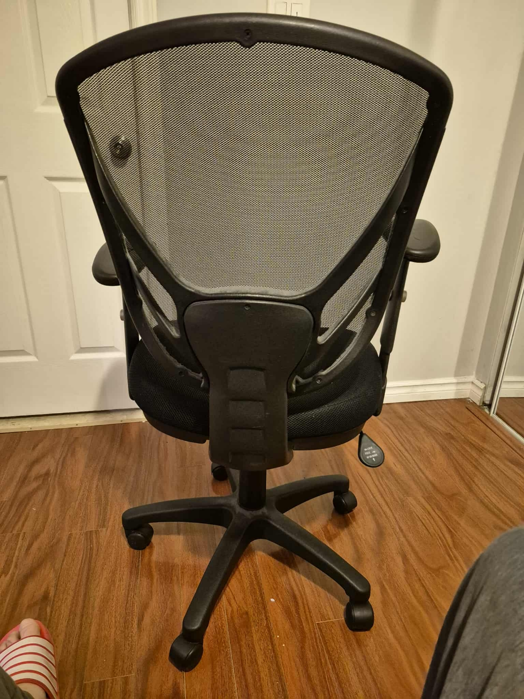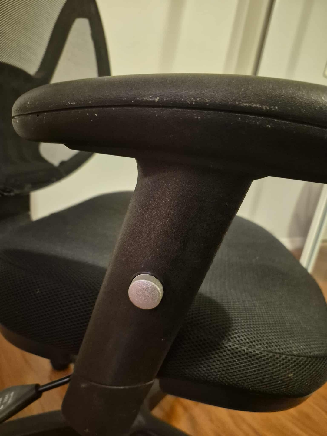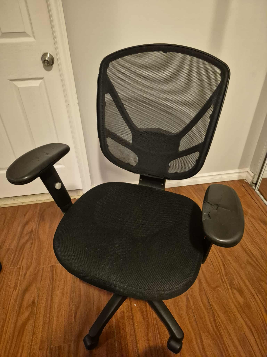 Comfortable office chair, mesh back, black fabric seat. Adjustable height. One armrest shows some cracks. foldable handles with adjustable height.